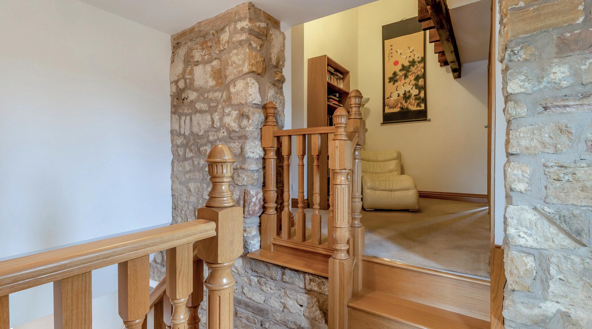 The landing displays exposed timbers and stonework and has a window commanding scenic views.