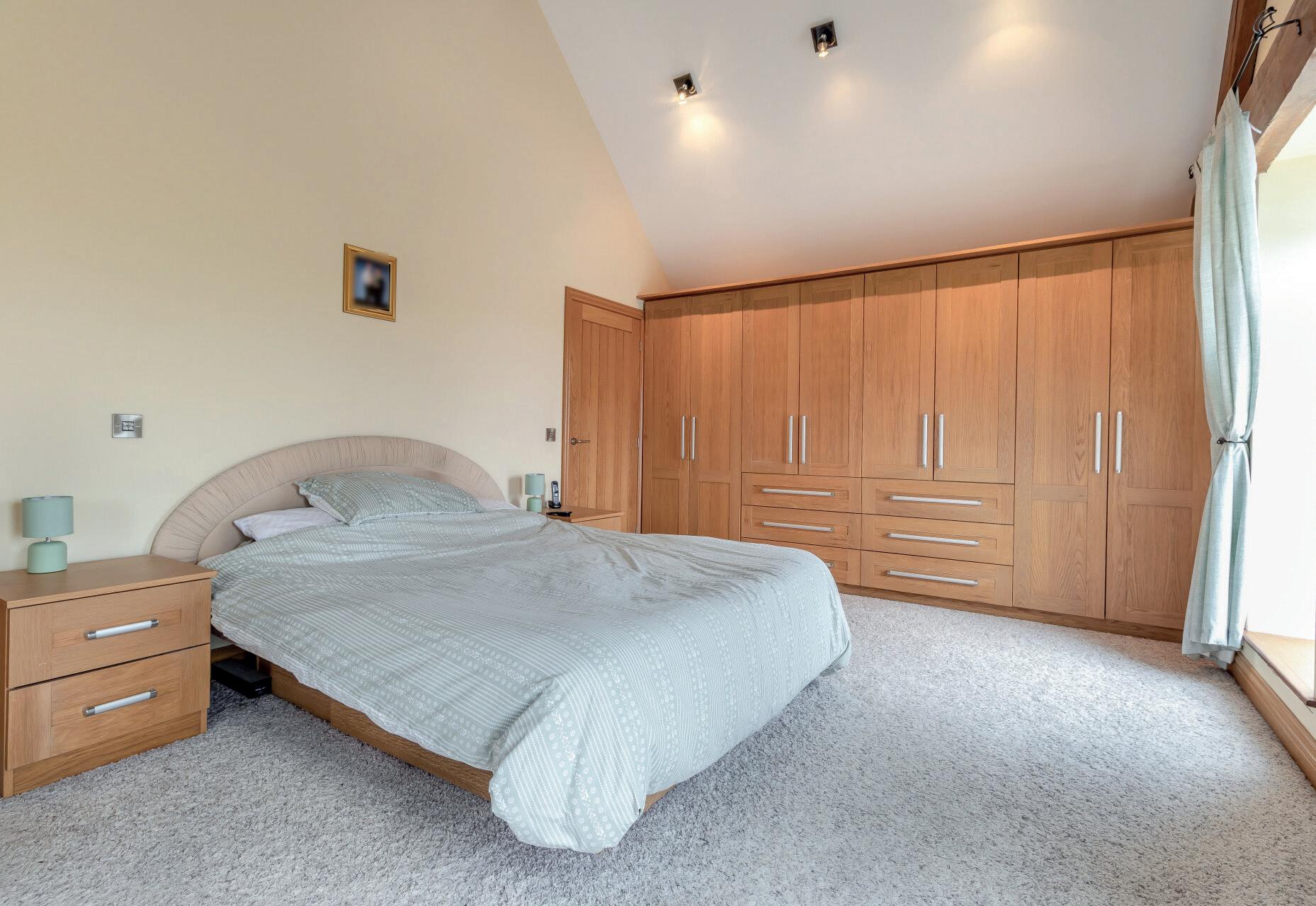 The principal bedroom suite has two full height fixed windows commanding a stunning outlook over the grounds and adjoining countryside, has an additional window overlooking the courtyard, exposed beams into the apex of the ceiling and fitted furniture incorporating wardrobes, drawer units and bedside tables. An en-suite shower room presents a three-piece suite which has full tiling to the walls and floor and a frosted window.