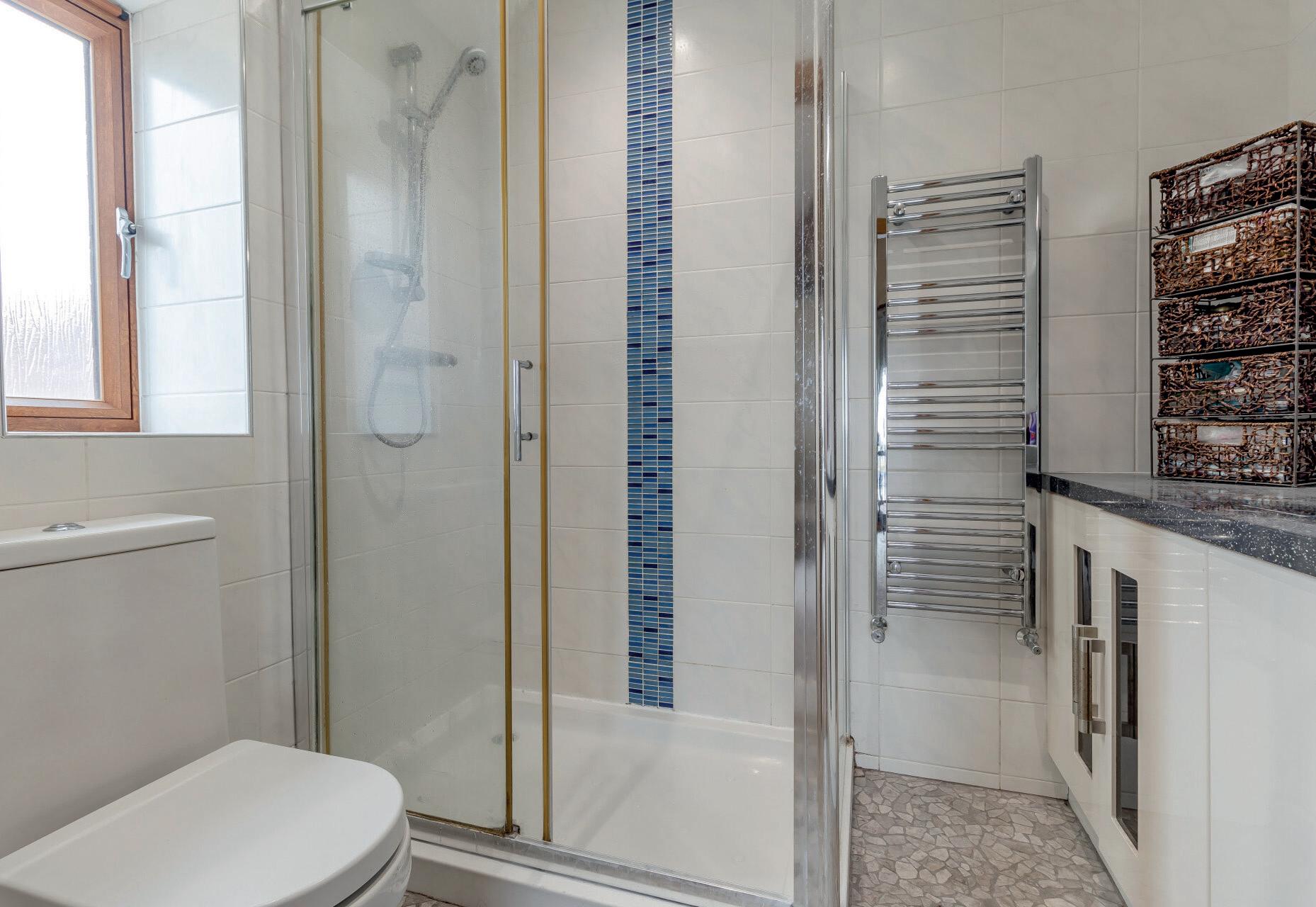 The family bathroom is presented with a double ended bath with a tiled surround, a low flush W.C, and a wash hand basin which sits on a floating base. This room has exposed beam work, complimentary tiling to the walls and a frosted window.