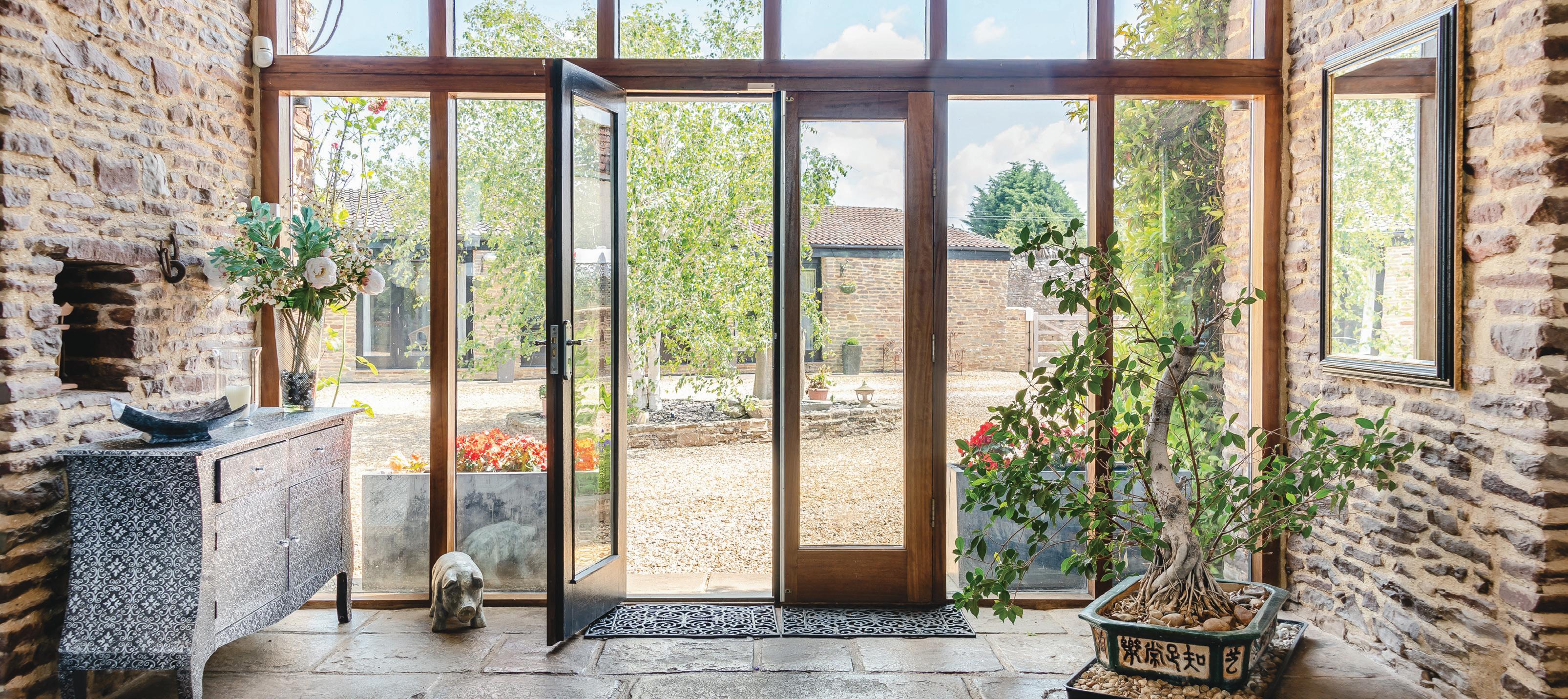 But this beautiful barn still offers so much more to explore. Behind a door in the central area is a garden room that is all about the view and the effortless flow inside to outside via a whole wall of glass that can be completely opened. It’s a quiet space for peaceful reading or somewhere to retire after a meal. However, as with most rooms in this versatile home, it’s a space that can morph itself to an owner’s desiremaybe a games room with a bar or a family room with toys and play mats?