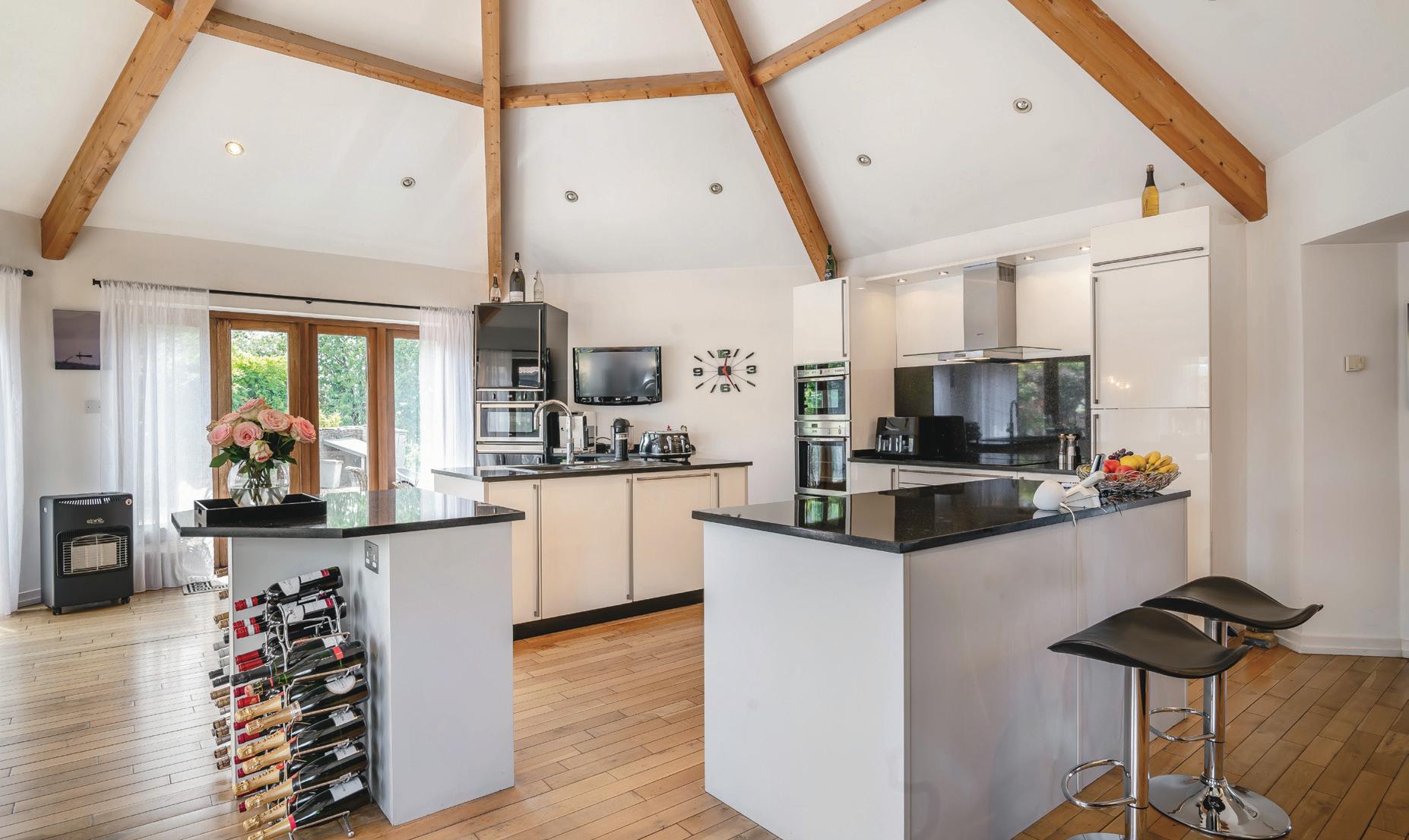 Directly through a door within the dining space reveals a very special space - a wellequipped kitchen diner that is a unique octagonal shape, creating a wrap-around view through multiple windows and doors and a ceiling beam structure that ensures your gaze is fixed in wonder as you enter and look up. More surprises include a trio of kitchen islands that cleverly denote a designated space for the cook to perform within this most spectacular room.