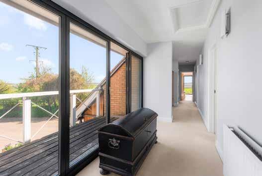 Beyond this core living space there is a separate ground floor sitting room currently arranged as a television room, together with a further reception room used as a study capable of accommodating multiple workstations. A gym positioned adjacent to the integral garage adds another practical and versatile element to the ground floor layout. A particularly striking feature of the house is the large first floor sitting room which opens onto balconies through full height glazed doors and takes full advantage of the long southerly views across the valley. This elevated reception space gives the house an additional dimension and allows the landscape setting to become part of the experience of living here.