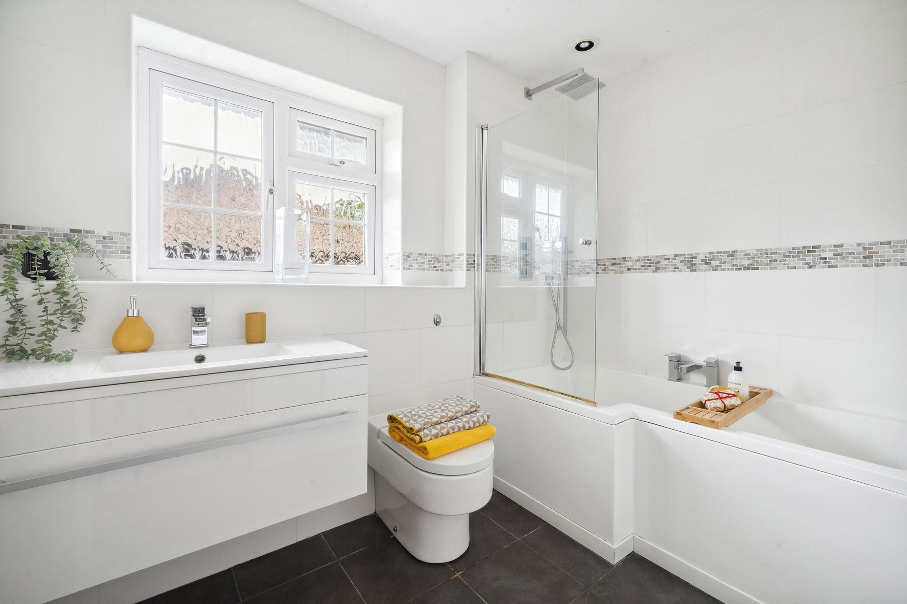The gorgeous westerly rear facing garden with patio and lawn is ideal for alfresco dining and enjoying the summer sun.