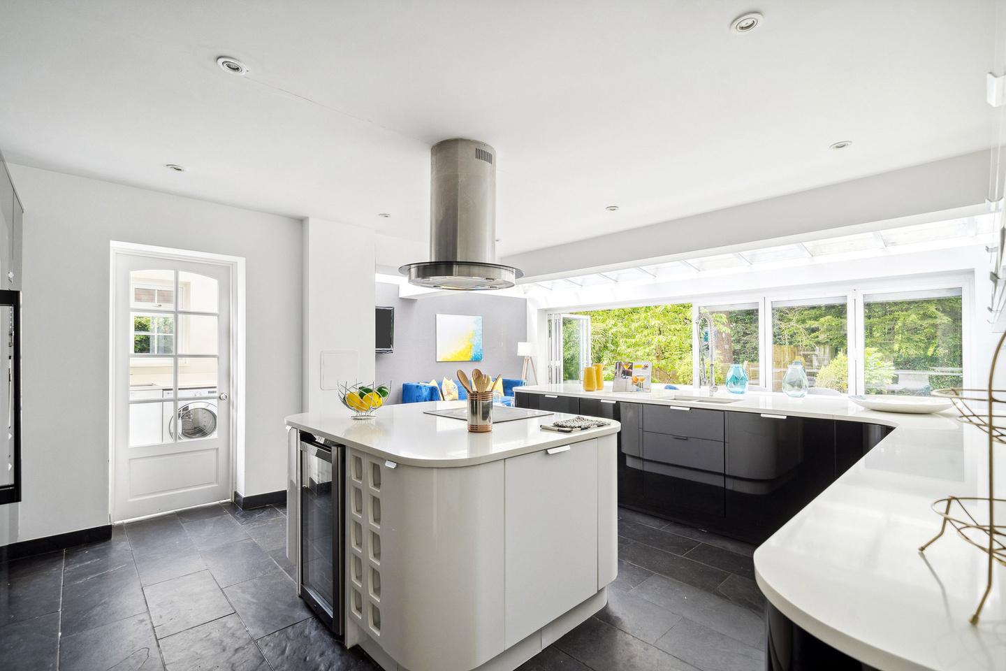 The kitchen has underfloor heating and is equipped with a range of cabinetry, granite surfaces, integrated appliances, central island and breakfast bar, benefitting from a separate utility room.