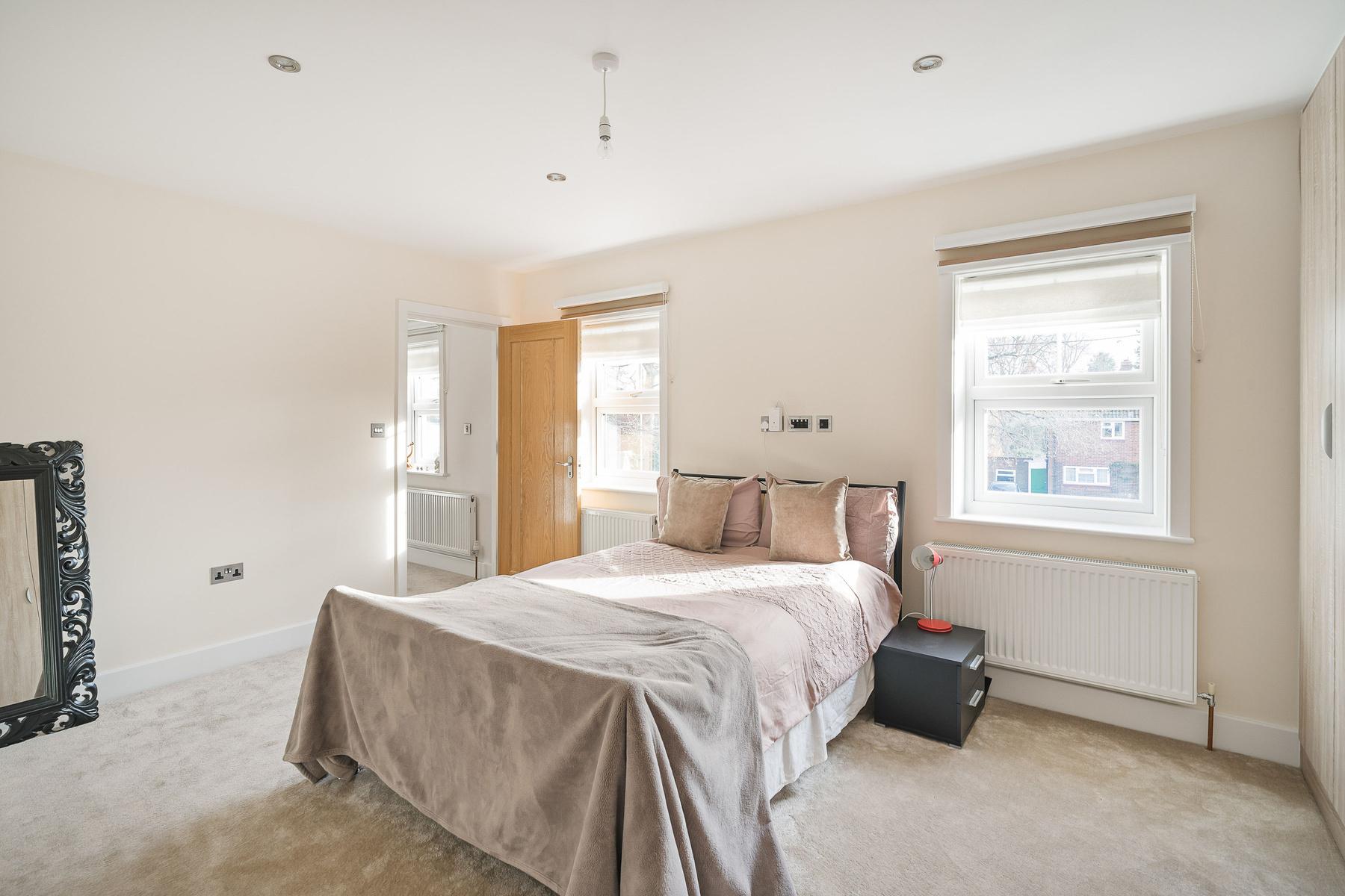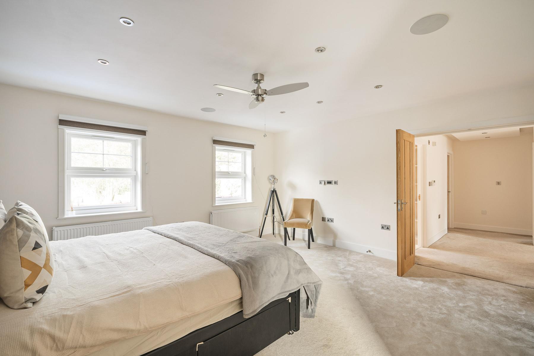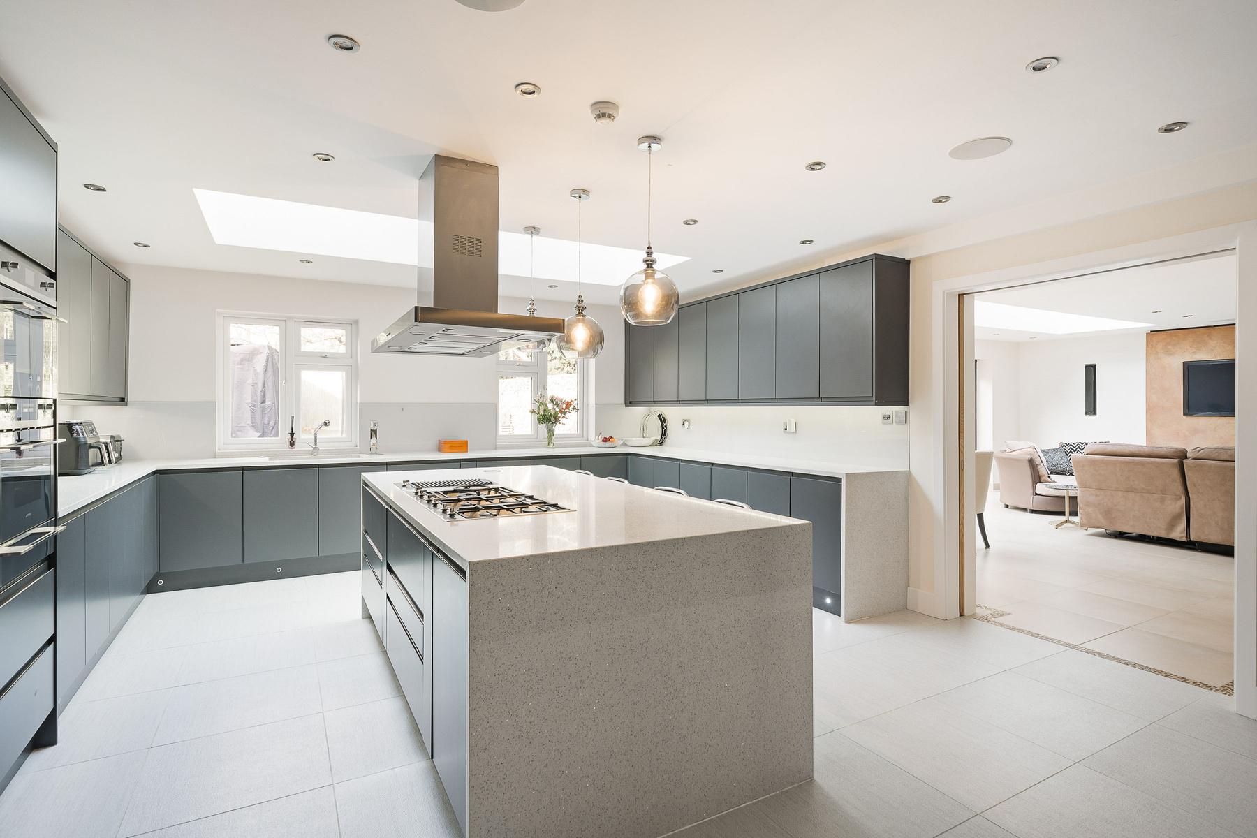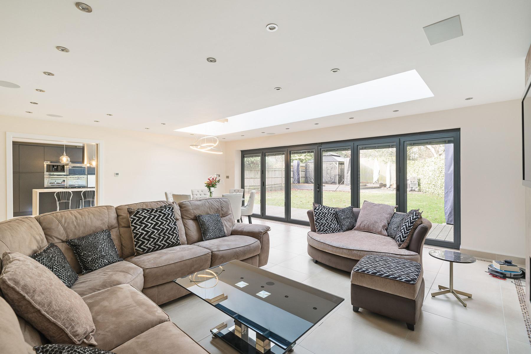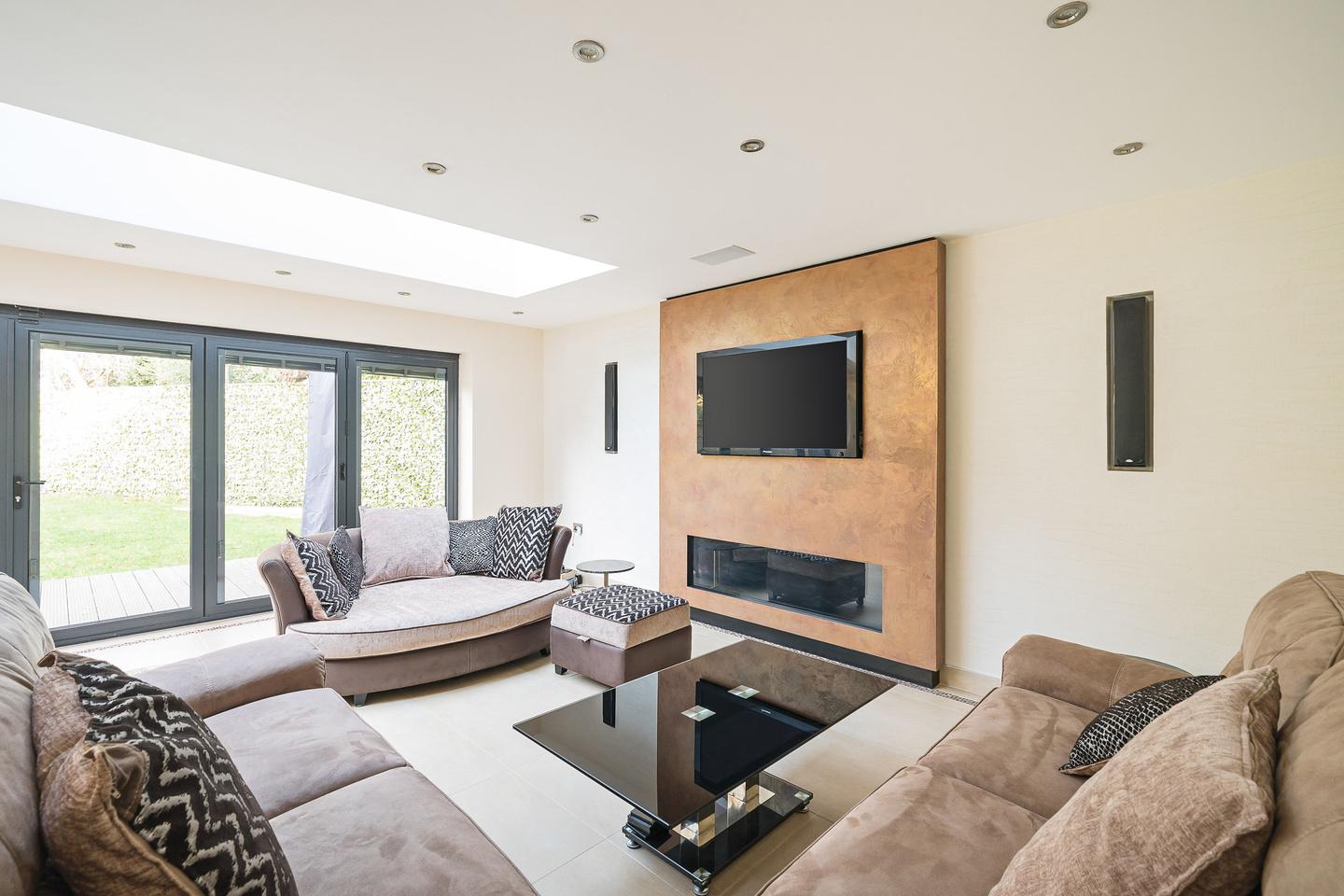 From the exceptionally large living room, with abundant space for dining, bifolding doors open up onto the garden. The living room also offers a stunning feature fireplace, with a bronze, Italian plastered finish and roof lantern. The kitchen is elegantly designed with substantial cabinetry, a central island, integrated appliances and ample stone worktops. A separate utility room also leads off from the kitchen.
