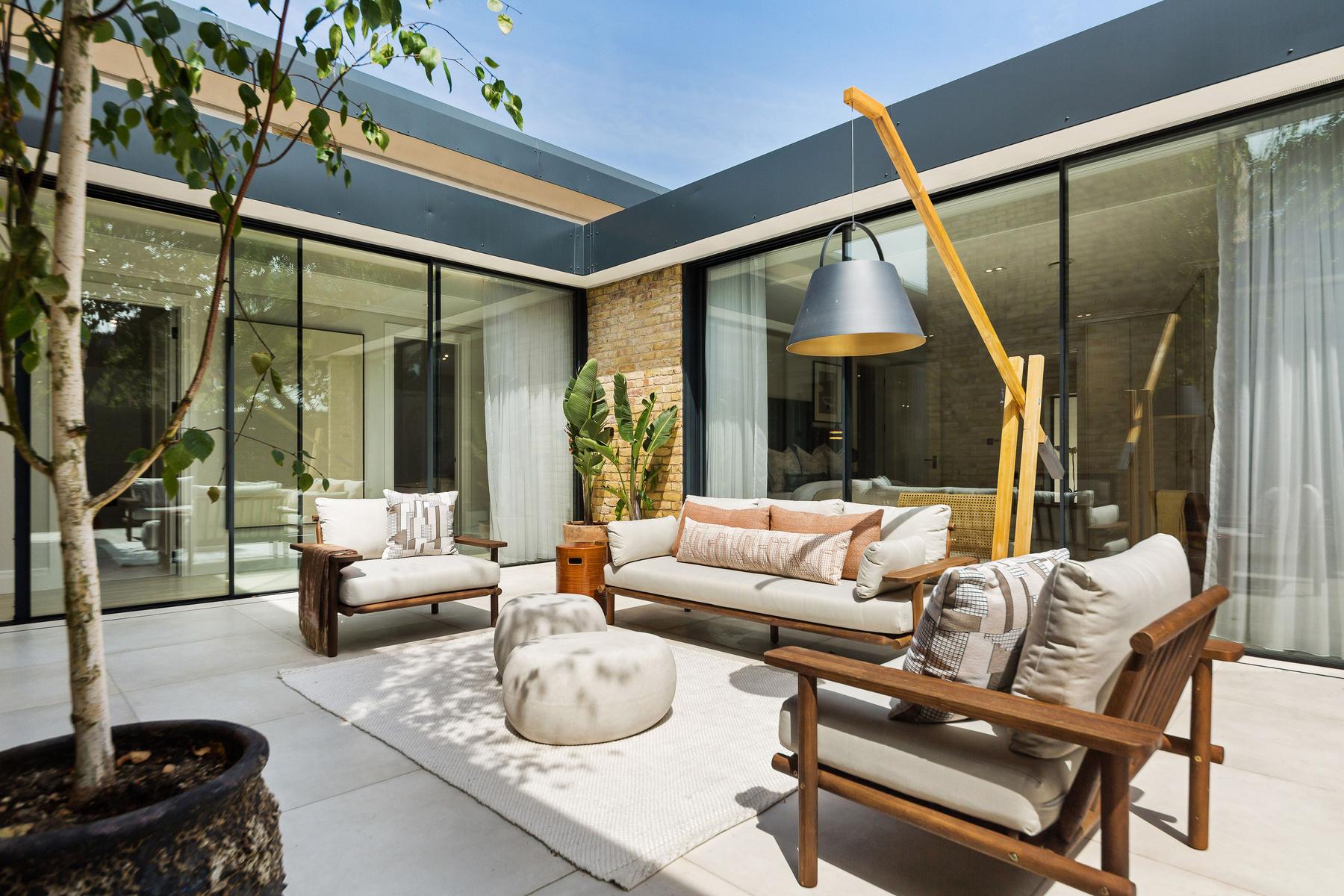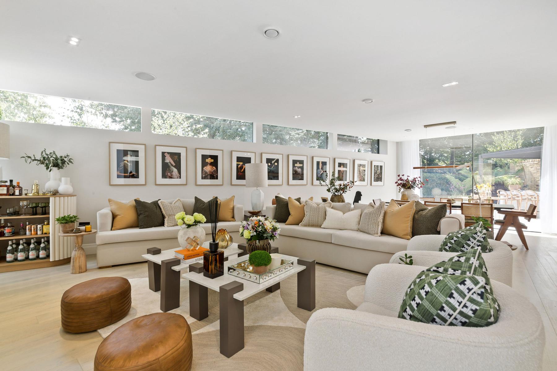Positioned as the final property of Rosslyn Avenue, on the verge of the Beverley Brook river, sits the opportunity to own one of West London’s most unique homes. This gorgeous home offers a contemporary unilateral layout that offers the highest standard of fit out and interior design. The house is made of up four bedrooms, three bathrooms (including two en-suites) and a long, wide entrance hall leading to a large open plan kitchen/living room. A dual aspect indoor / outdoor fireplace takes centre stage, with the outdoor kitchen & BBQ area at the rear adding a perfect extended space for entertaining. There is a treelined private riverside garden that curves around the bank of the brook. The garden starts at the front of the property, passes the centre outside living space then leads back to the rear entertainment area that features and outdoor kitchen and BBQ. There is gated parking for two, further parking within the detached garage as well as a home office / gym.