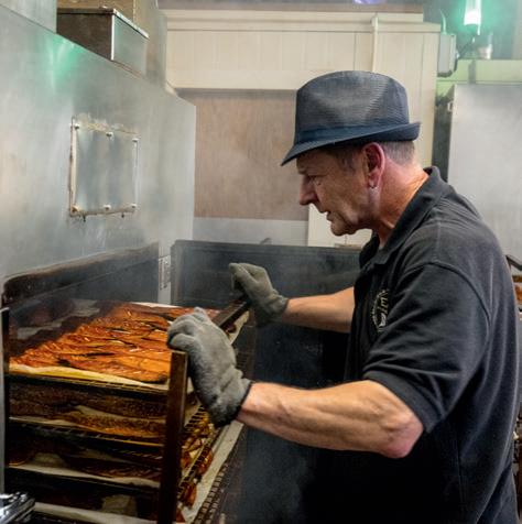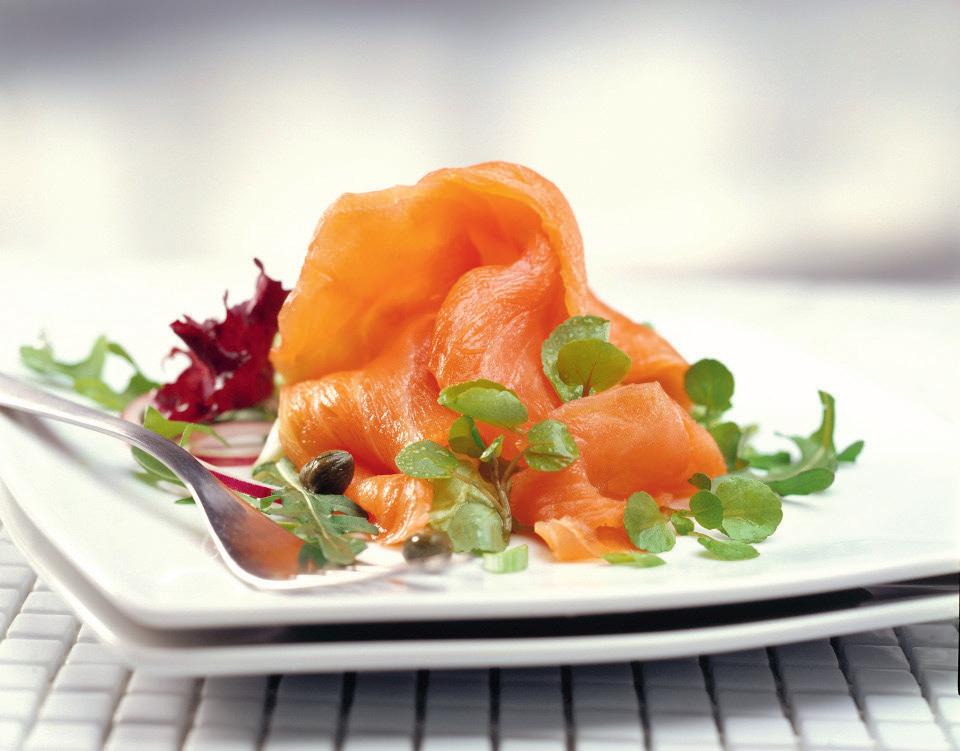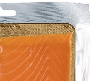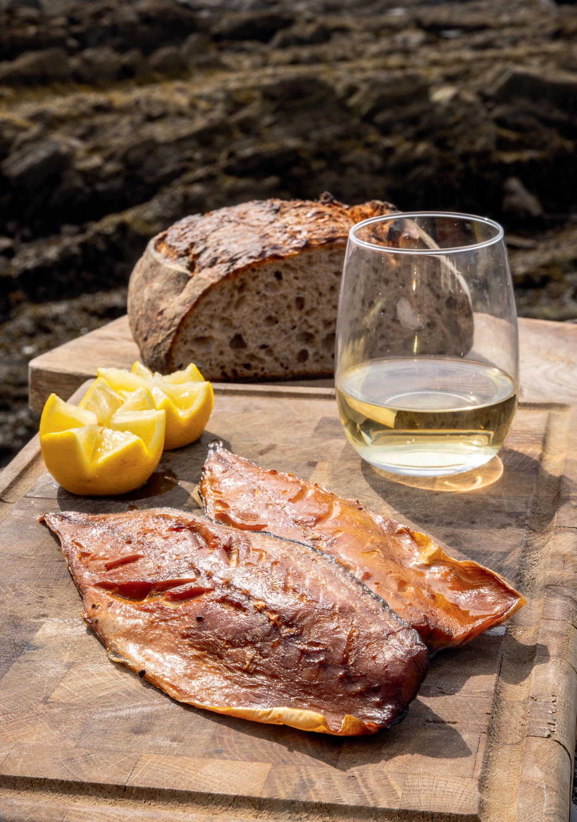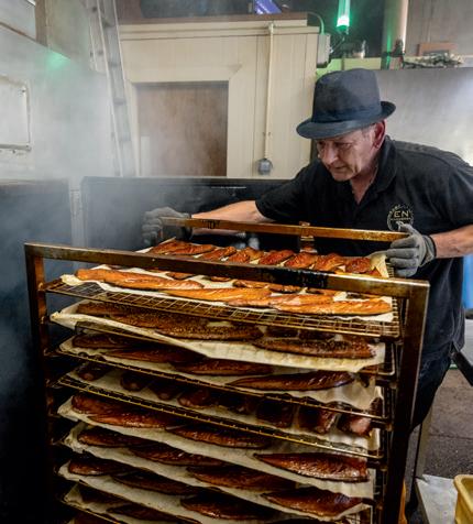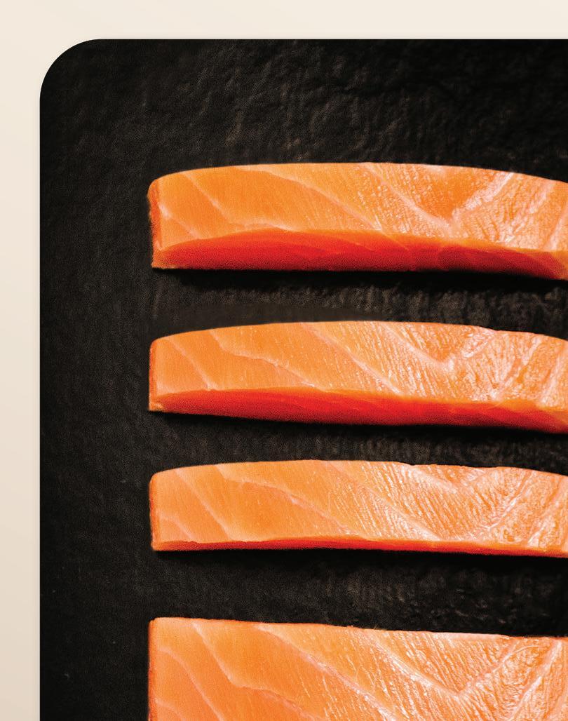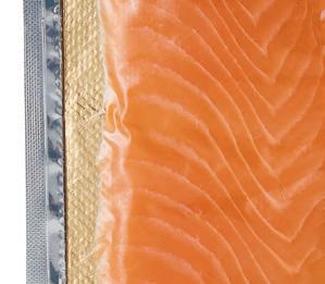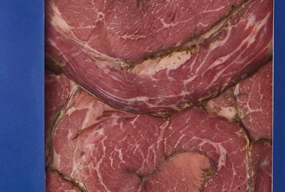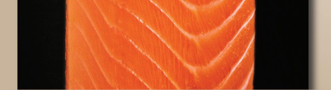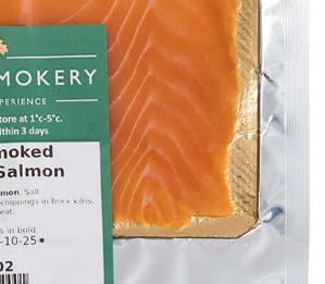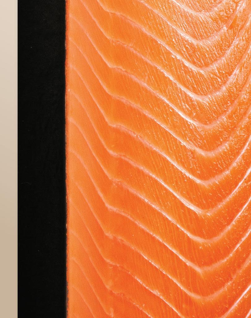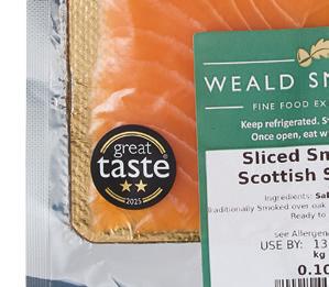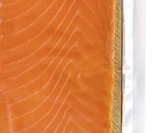 A very beautiful centre cut fillet – this salmon could almost pass for wild in its lack of fat seams and its deep colouration. It slices exceptionally well and the texture on the palate is delightfully resilient. Sweetness, salinity and oak smoke appear in perfect balance, It looks as though the fish was skinned, seasoned and smoked from both sides – certainly the palate impact is remarkably even, regardless of which end or which side is sampled. The taste is remarkably clean and the overall e ect is of an irresistible product, perfectly achieved. Our chef judge declared that this has the air of a product executed by a highly skilled chef in a high-end restaurant – he is amazed that it could be available for retail.