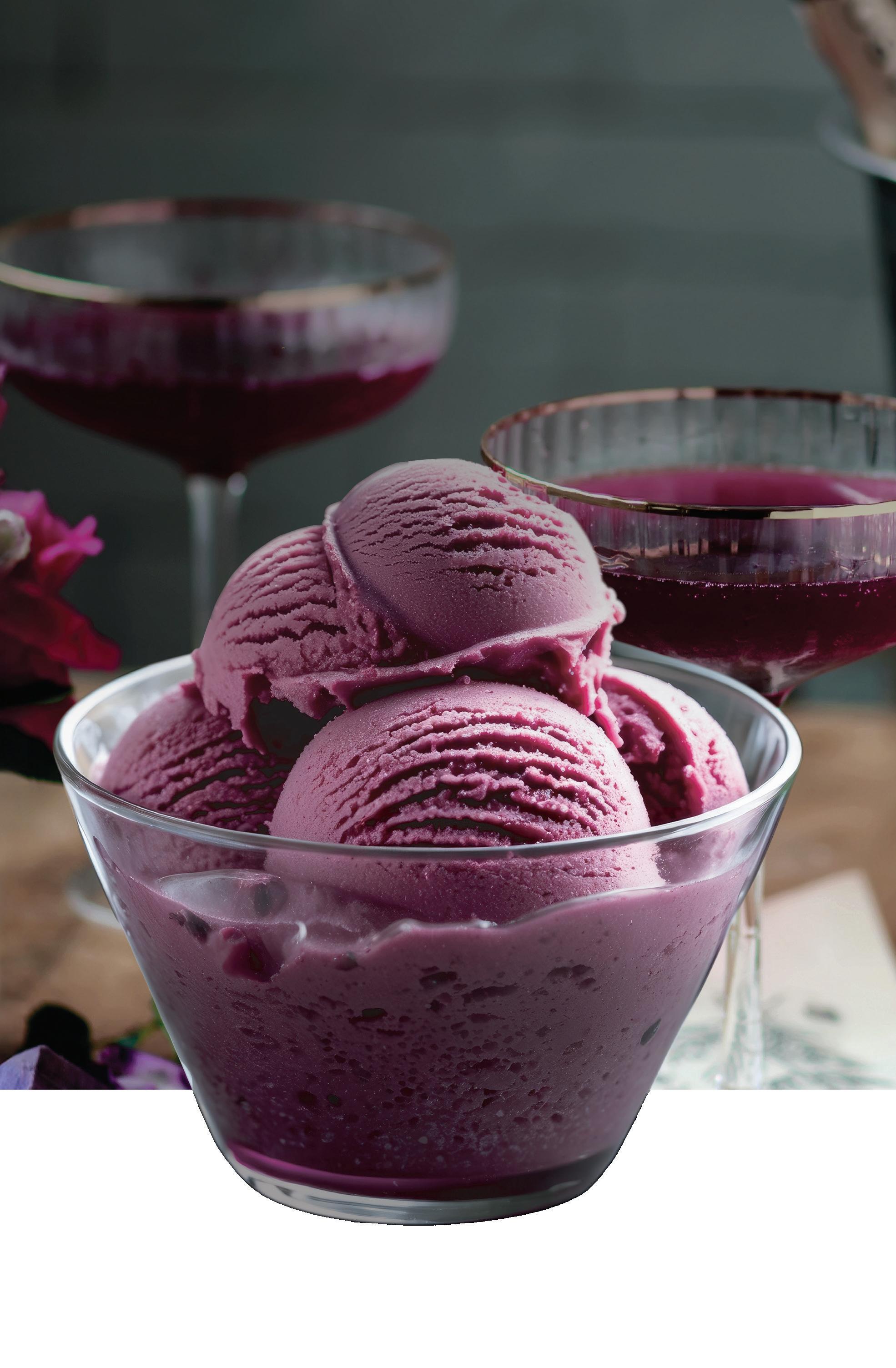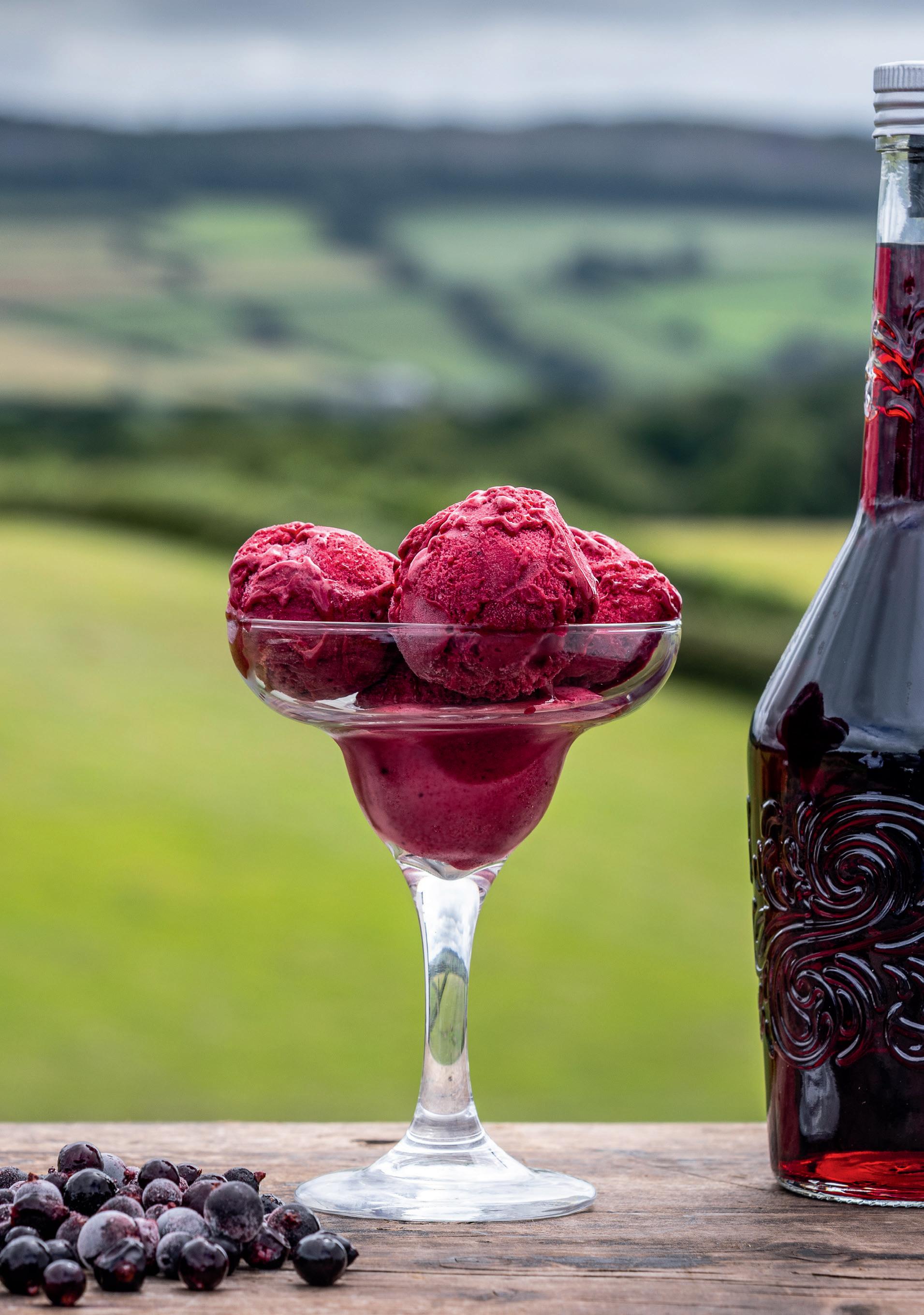 Sometimes, inspiration arrives seasonally. Facing a recent glut of fresh blackcurrants, the Dallavalles decided to make a batch of their house blackcurrant sorbet – but this time as a riff on a Kir Royale. The addition of Crème de Cassis evokes the classic French cocktail of Champagne and blackcurrant liqueur. Fran recommends that the sorbet is served in a glass with sparkling wine poured over the top.