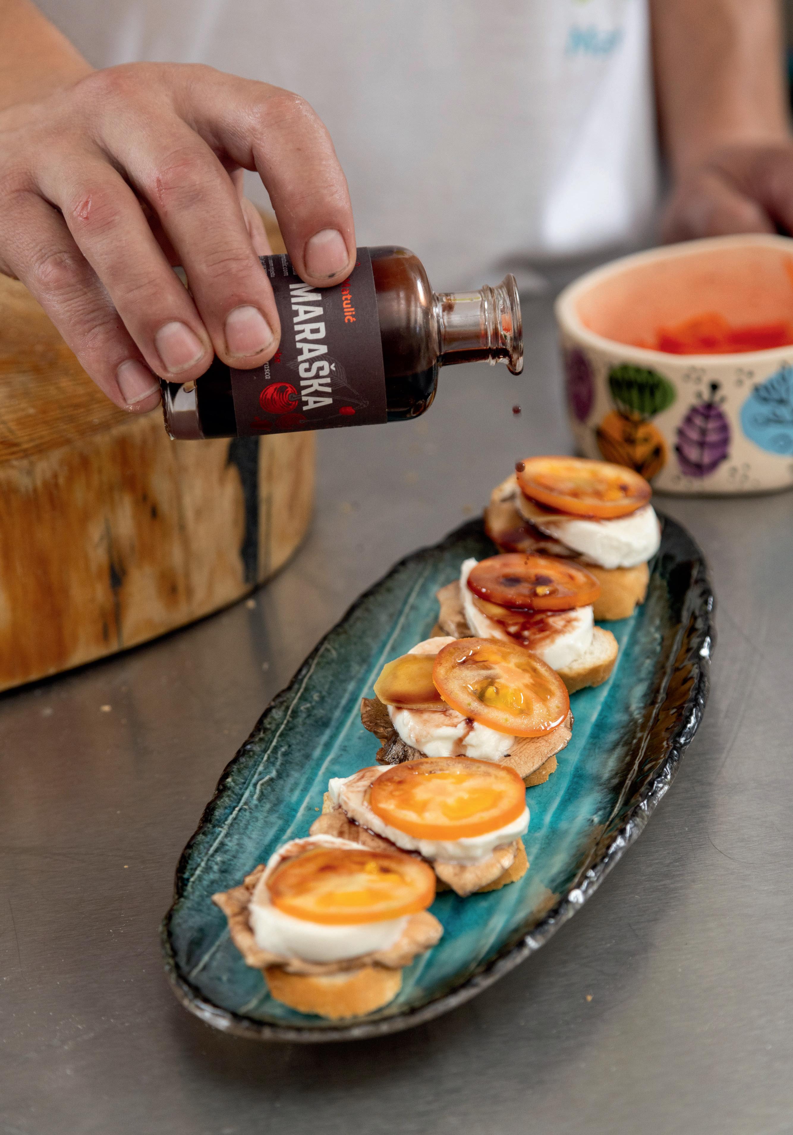 Maraška Aceto is both a very simple product – it is made from just sour cherry juice, wine vinegar, and sugar – but also richly complex. The couple enjoys it in everything from gin & tonics to cheesecake, and even in some seafood dishes.