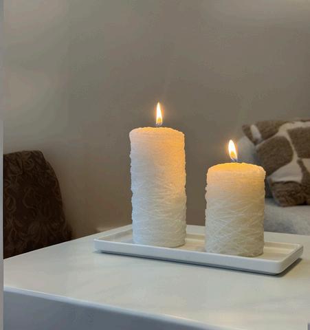 Pelarljus av paraffin, med frostad yta. Bränn alltid ljuset i dragfri miljö, Då behåller ljusetsin vackra form och rinner inte.