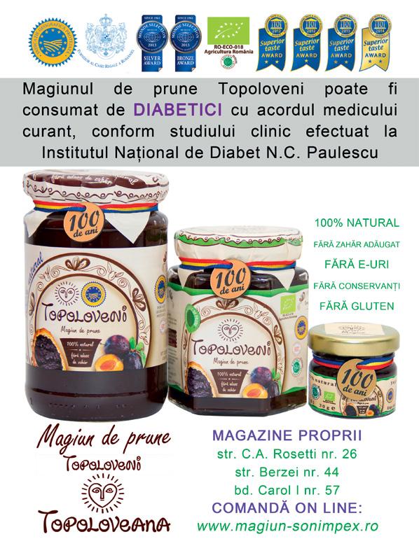 În această epocă a Alimentelor Industrial - Culturale, impuse de globalizare şi dorinţa acerbă a câştigului, am demonstrat că se poate procesa, industrial, o reţetă din 1914. Magiunul de prune Topoloveni este un produs tradiţional românesc care a fost definit de Institutul de Diabetologie şi Nutriţie NC Paulescu ca permis consumului de către persoanele bolnave de diabet, cu acceptul medicului curant, respectând principiul excluderii cantităţii echivalente de glucide din alte alimente zilnice.