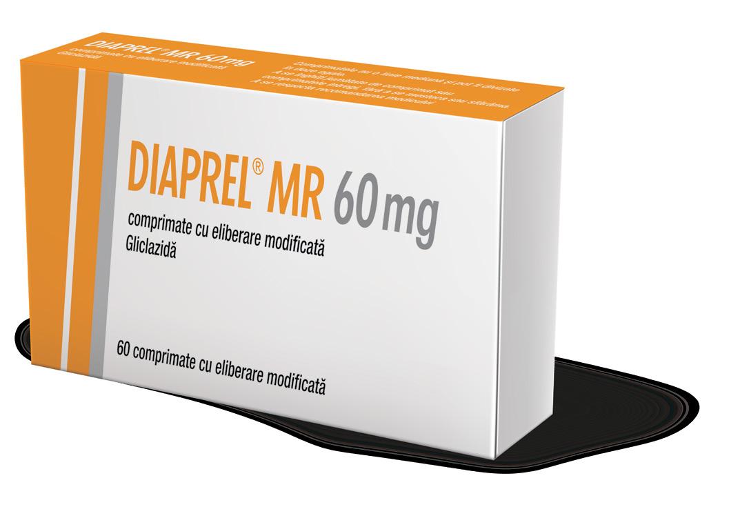 Denumirea comercială a medicamentului: DIAPREL MR 60 mg comprimate cu eliberare modificată. Compoziţia calitativă şi cantitativă*: Un comprimat cu eliberare modificată conţine gliclazidă 60 mg. Excipient cu efect cunoscut: lactoză monohidrat. Forma farmaceutică: Comprimat cu eliberare modificată. Comprimate oblongi, de culoare albă, cu o linie mediană şi marcate cu ,,DIA 60’’ pe ambele feţe. Comprimatul poate fi divizat în doze egale. Indicaţii terapeutice: Diabet non-insulino-dependent (de tip 2) la adulţi, atunci când regimul dietetic, exerciţiul fizic şi scăderea în greutate nu sunt suficiente pentru a controla glicemia. Doze şi mod de administrare*: Doza zilnică de DIAPREL MR 60 mg poate varia de la o jumătate de comprimat la 2 comprimate (30-120 mg gliclazidă) administrate oral, în doză unică, la micul dejun. Similar celorlalte antidiabetice orale, doza de gliclazidă trebuie ajustată în funcţie de răspunsul metabolic individual al pacientului (glicemie, HbA1c). Doza iniţială recomandată este de 30 mg pe zi (jumătate de comprimat DIAPREL MR 60 mg). În cazul în care glicemia este bine controlată, această doză poate fi utilizată şi pentru tratamentul de întreţinere. Dacă glicemia nu este controlată adecvat, doza poate fi crescută treptat la 60, 90 sau 120 mg gliclazidă pe zi. Intervalul între fiecare creştere a dozei trebuie să fie de cel puţin 1 lună, cu excepţia pacienţilor a căror glicemie nu a fost redusă după două săptămâni de tratament. În asemenea cazuri, doza poate fi crescută la sfârşitul săptămânii a doua de tratament. Doza maximă recomandată este de 120 mg gliclazidă pe zi. Posibilitatea de rupere a comprimatelor cu eliberare modificată de DIAPREL MR 60 mg permite un dozaj flexibil. Tratament asociat cu alte antidiabetice: DIAPREL MR 60 mg poate fi administrat în asociere cu biguanide, inhibitori de alfa-glucozidază sau insulină (sub strictă supraveghere medicală). Contraindicaţii*: Hipersensibilitate la gliclazidă sau la oricare dintre excipienţi, alte sulfoniluree, sulfonamide. Diabet zaharat tip 1. Precomă şi comă diabetică, cetoacidoză diabetică. Insuficienţă renală sau hepatică severă: în acest caz se recomandă utilizarea insulinei. Tratament cu miconazol (vezi pct. „Interacţiuni cu alte medicamente şi alte forme de interacţiune”). Alăptare (vezi pct. „Fertilitatea, sarcina şi alăptarea”). Atenţionări şi precauţii speciale pentru utilizare*: Hipoglicemia: Acest tratament trebuie recomandat doar dacă pacienţii au un aport alimentar regulat (incluzând şi micul dejun). Este important ca aceştia să aibă un aport regulat de carbohidraţi, din cauza riscului crescut de hipoglicemie, în cazul în care aportul alimentar este întârziat, insuficient sau cu conţinut scăzut de carbohidraţi. Hipoglicemia este mai posibil să apară în timpul dietelor hipocalorice, după efort fizic prelungit sau intens, în cazul consumului de alcool etilic sau dacă se utilizează o combinaţie de medicamente hipoglicemiante. Hipoglicemia poate să apară după administrarea de sulfoniluree. Insuficienţa renală şi hepatică: farmacocinetica şi/sau farmacodinamia gliclazidei pot fi modificate la pacienţii cu insuficienţă hepatică sau insuficienţă renală severă. În cazul apariţiei unui episod hipoglicemic la aceşti pacienţi, există riscul ca acesta să fie prelungit, ca urmare fiind recomandată o abordare terapeutică adecvată. Se recomandă precauţie la utilizarea la pacienţii cu deficit de G6PD. Au fost descrise cazuri de porfirie acută la pacienții care au porfirie. Excipienţi: conţine lactoză monohidrat. Interacțiuni cu alte medicamente și alte forme de interacțiune*: Administrare concomitentă contraindicată: miconazol. Administrare concomitentă nerecomandată: fenilbutazonă (administrate sistemic); alcool etilic; danazol. Administrare concomitentă care necesită precauţie la utilizare: alte medicamente antidiabetice, beta-blocante, fluconazol, inhibitori ai enzimei de conversie a angiotensinei (captopril, enalapril), antagonişti ai receptorilor H2, IMAO, sulfonamide, claritromicină, antiinflamatoare nesteroidiene; clorpromazină (neuroleptic); corticosteroizi (administrare sistemică şi topică: intraarticulară, cutanată, rectală) şi tetracosactidă; ritodrină, salbutamol, terbutalină (i.v.); produse din sunătoare (Hypericum perforatum); fluorochinolone. Administrare concomitentă de care trebuie ţinut cont: tratament cu anticoagulante (de exemplu warfarina). Fertilitatea, sarcina şi alăptarea*: Sarcina: Ca măsură de precauție, este de preferat să se evite utilizarea gliclazidei în timpul sarcinii. Pentru tratamentul diabetului în timpul sarcinii nu se recomandă utilizarea antidiabeticelor orale, insulina fiind medicamentul de primă intenţie. Alăptarea: Din cauza riscului de hipoglicemie neonatală, acest medicament este contraindicat în timpul alăptării. Efecte asupra capacităţii de a conduce vehicule şi de a folosi utilaje*: DIAPREL MR 60 mg nu are nici o influență asupra capacității de a conduce vehicule și de a folosi utilaje. Cu toate acestea, pacienţii trebuie avertizaţi asupra simptomelor hipoglicemiei şi trebuie să fie atenţi atunci când conduc vehicule sau folosesc utilaje, în special la începutul tratamentului. Reacţii adverse*: Hipoglicemie. Alte reacţii adverse: tulburări gastro-intestinale, incluzând dureri abdominale, greaţă, vărsături, dispepsie, diaree şi constipaţie. Rare: erupţii cutanate tranzitorii, prurit, urticarie, angioedem, eritem, erupţii maculopapulare, reacţii buloase (cum sunt sindrom Stevens-Johnson și necroliză epidermică toxică și afecțiuni buloase autoimune) și, excepțional, erupție cutanată medicamentoasă cu eozinofilie și simptome sistemice; anemie, leucopenie, trombocitopenie, granulocitopenie, creştere a valorilor serice ale 