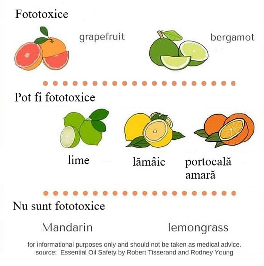 ele, obținute prin distilare pot fi folosite în siguranță. Spre exemplu, uleiurile de lime și de lămâie obținute prin distilare NU sunt fototoxice. De asemenea, nu toate uleiurile din citrice sunt fotosensibilizante. Uleiul din portocală dulce (engl. Sweet Orange), uleiurile din mandarină obținute prin presare (engl. Mandarin, Tangerine) NU sunt fototoxice. (Fig. 3).