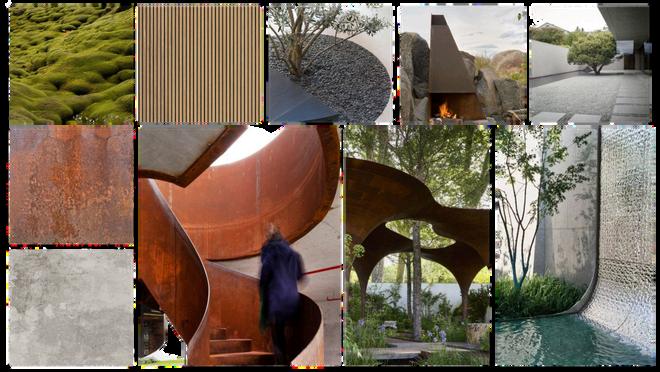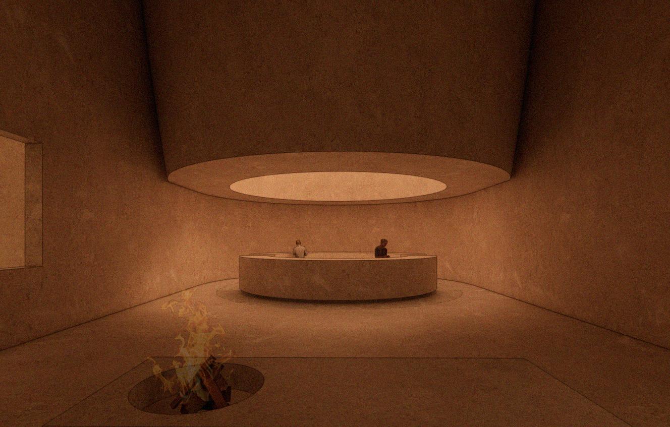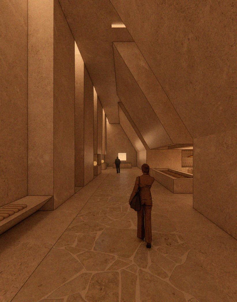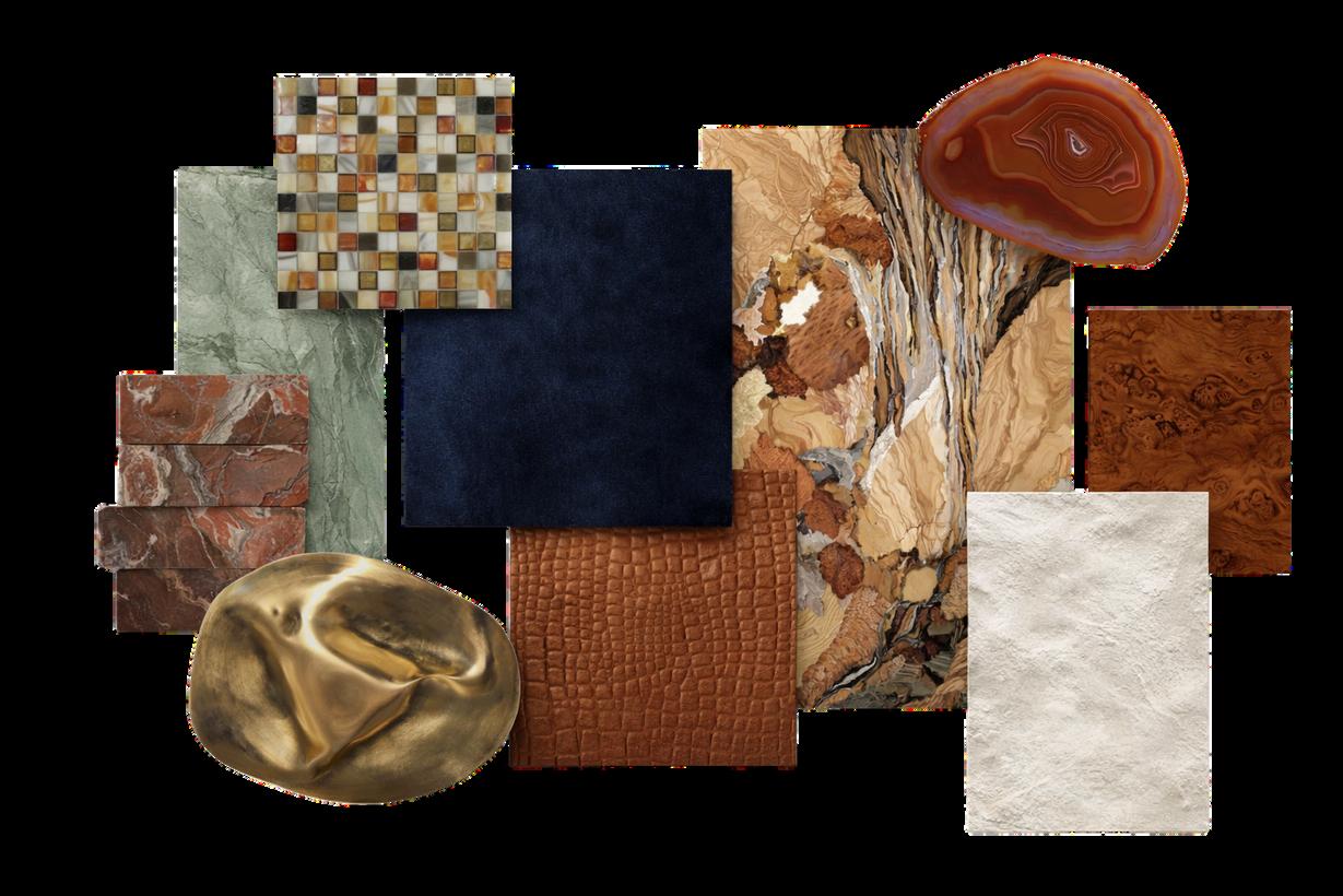 The color and material palette dra from the layered tones and textures rock strata. Moving from rough, tact surfaces to smoother, polished finish the material transitions reflect t passage of time and geologic compression.