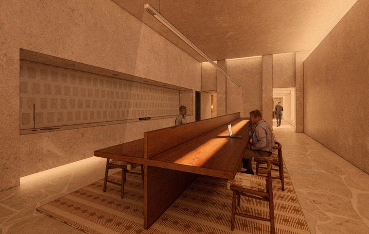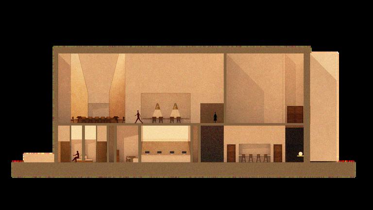 Clients are guided through the central makerspace before moving along processional corridors that lead to the presentation room, reinforcing a curated and ceremonial progression In contrast, employees access the office via a parallel ramp, arriving at a workspace composed of traditional, collaborative, and open-plan stations that support daily production