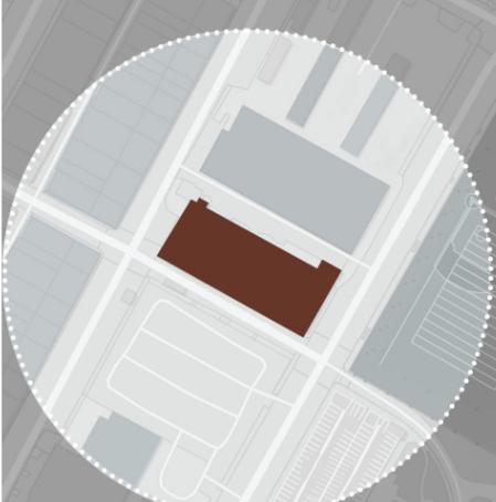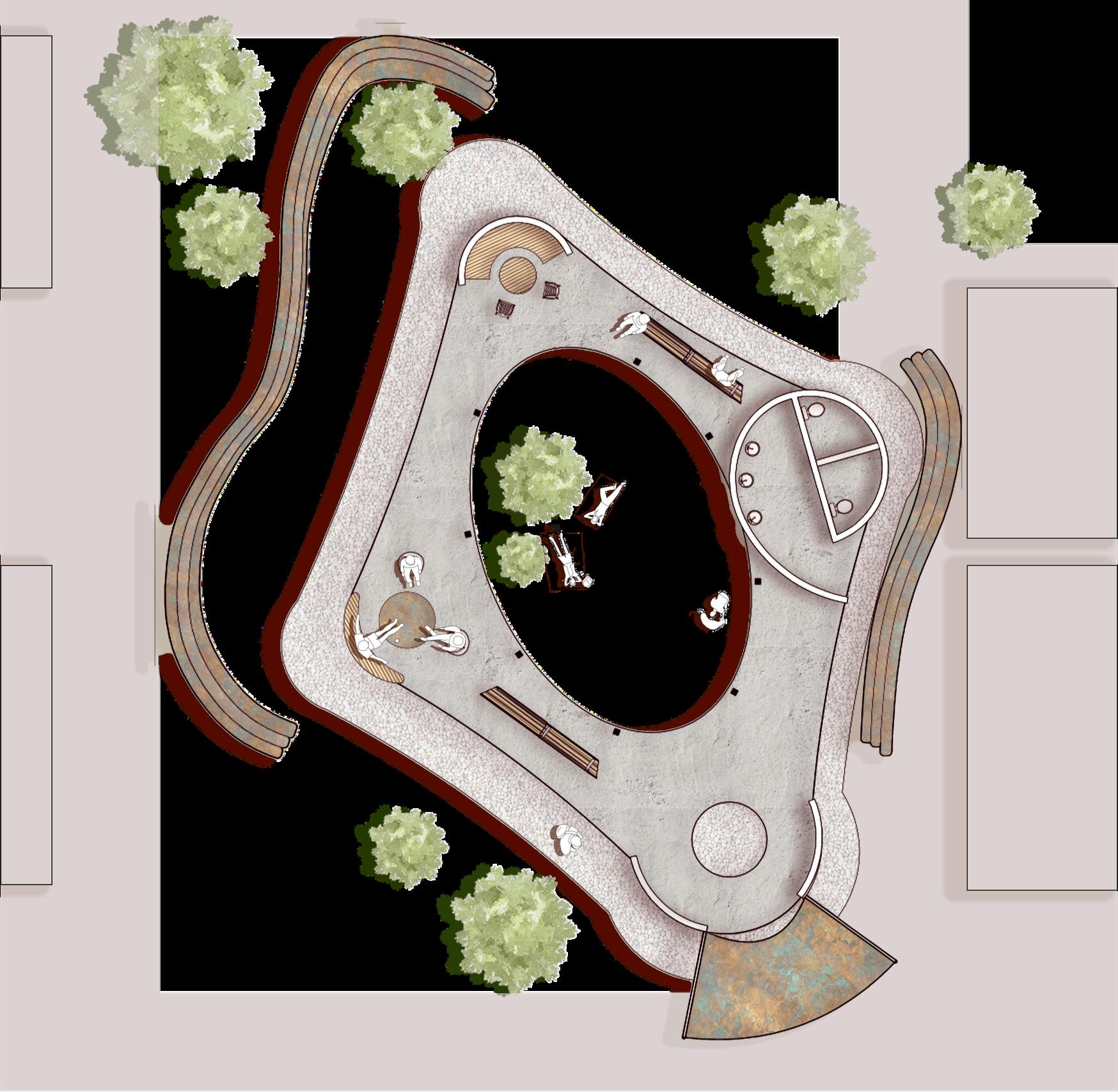 This concept begins by identifying the diverse users of the space, older community residents, students, young adults, and children, each represented as distinct yet interconnected elements. In contrast to the rigid grid of the surrounding campus and urban fabric, the design introduces organic forms that soften and interrupt the existing structure, creating a spatial break within the city. The circular forms symbolize individual programs, while bridging pathways connect them along a shared circulation spine, fostering interaction while maintaining distinct identities.