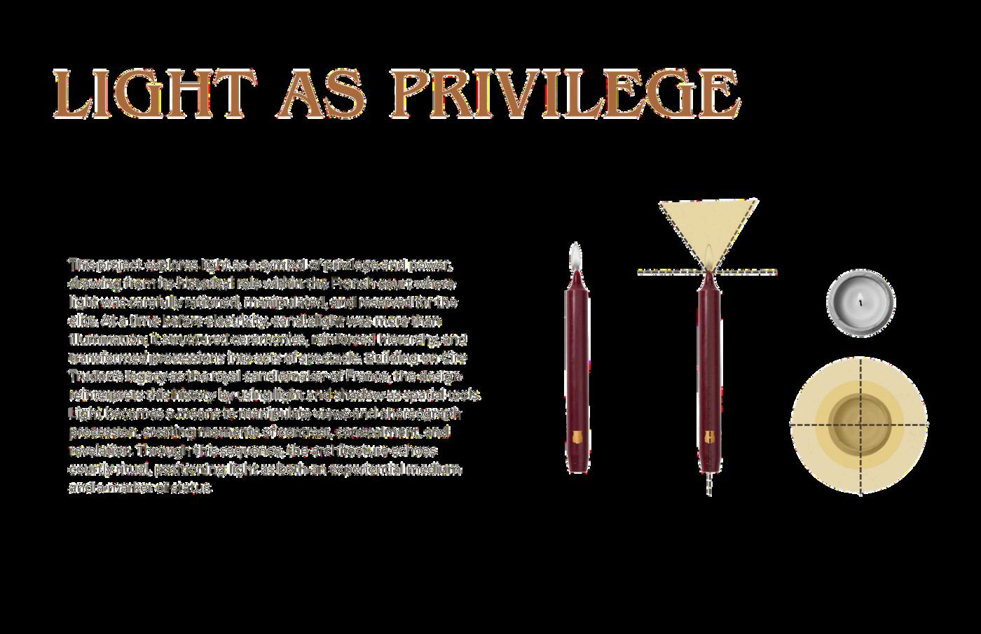 This project explores light as a symbol of privilege and power, drawing from its historical role in the French court, where candlelight was carefully controlled and reserved for the elite. Beyond illumination, light structured ceremony, reinforced hierarchy, and transformed movement into spectacle. Building on Cire Trudon’s legacy as the royal candlemaker of France, the design reinterprets this history through the spatial manipulation of light and shadow. Light is used to frame views, choreograph procession, and create moments of contrast, concealment, and revelation, echoing the ritualized experience of courtly life. Architecturally, the project abstracts the candle’s form: the triangular projection of light informs angular spatial gestures, while its circular top view generates recurring radial and cyclical motifs throughout the plan and detailing.