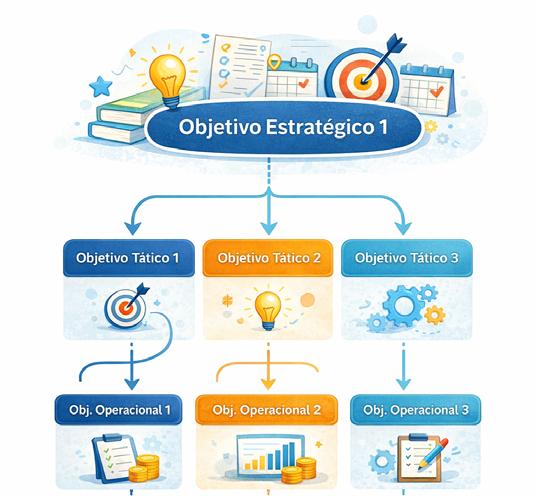 Em outras palavras, o conjunto de objetivos estratégicos definidos se transforma em objetivos táticos, que, por sua vez, se detalham em objetivos operacionais, garantindo alinhamento e integração em todas as etapas.
