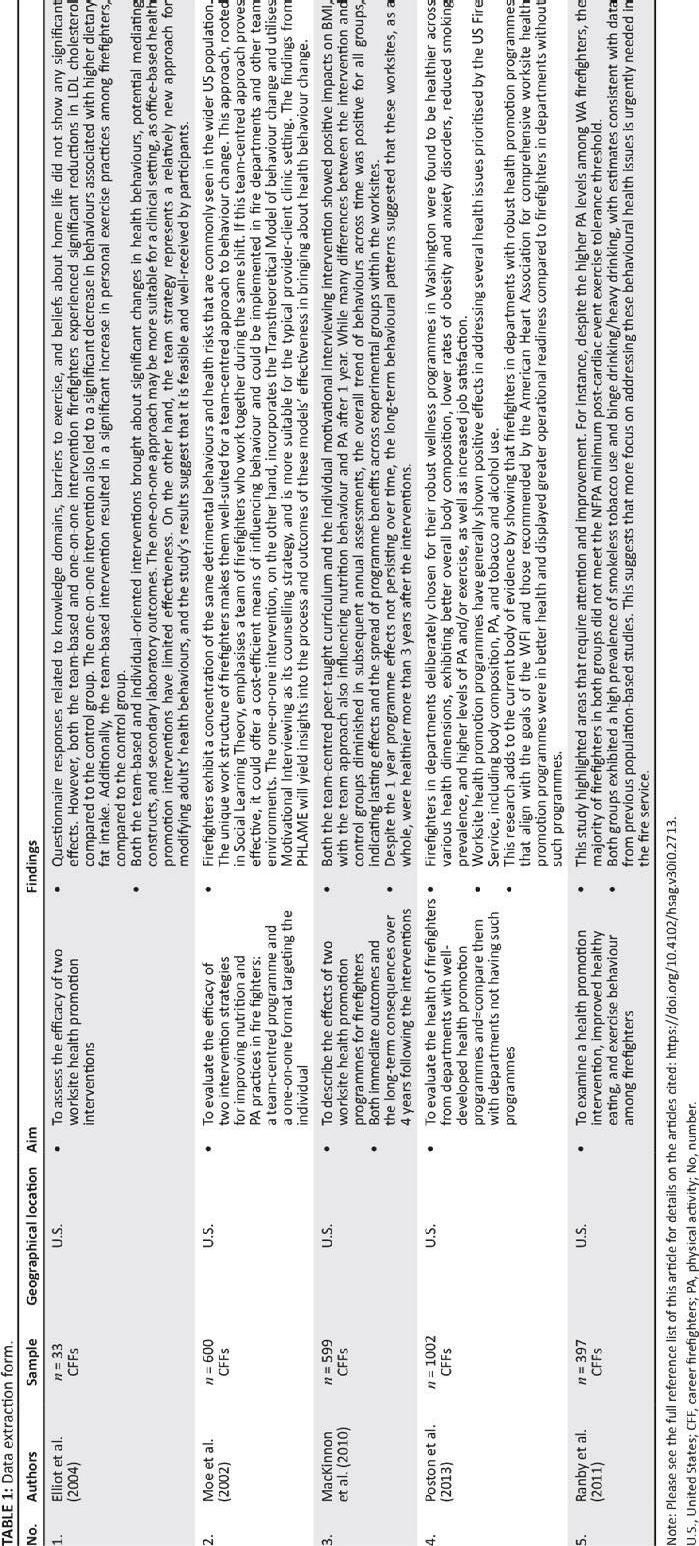 Rachele, J.N., Heesch, K.C. & Washington, T.L., 2014, ‘Wellness programmes at firefighter and police workplaces: A systematic review’, Health Behavior and Policy Review 1(4), 302–313. https://doi. org/10.14485/HBPR.1.4.5