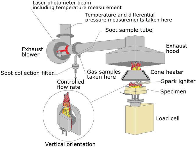 heater is used to ignite a sample material under test. The test sample rests upon a sensitive scale to measure the sample’s loss of mass during combustion. The products of the fire flow up into an exhaust system where instruments measure the oxygen consumption and thus the heat release rate, as well as a host of different properties, such as smoke and toxic gas production.