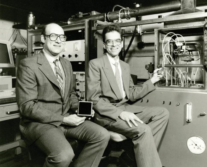 Vytenis Babrauskas (right) and Bill Twilley together with the cone calorimeter, which Babrauskas gestures toward with his left hand. Twilley is holding the sample holder platform for the cone calorimeter. In addition to sharing the R&D 100 Award with Twilley, Babrauskas won a NIST Bronze Medal in 1986 for the conception and standardization of the cone calorimeter. He also received NIST's Rosa Award in 1992 for his contributions to the science of heat release rate and his work to make the cone calorimeter an internationally used tool for the development of fire safety standards. Credit: NIST