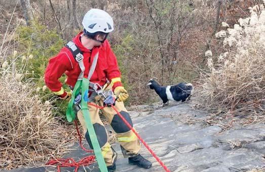 and attempt the rescue. Lt. Smith rappelled down the cliff and was able to rig a hasty harness to the animal and assist it back up to the edge. The animal sustained injuries possibly related to incident, but was returned safely to its environment.