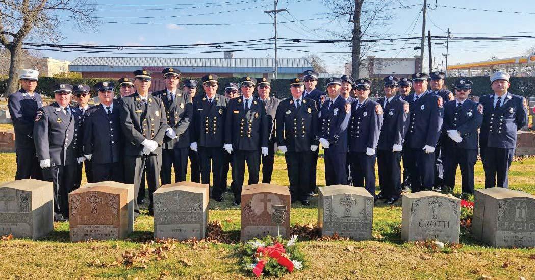 On December 7, 2025, members of Engine Company 1 of the Valley Stream Fire Department visited the graves of Captain John Tate and Captain Mike Moran. Both of these firefighters died as a result of burns they received while fighting a fire in a Valley Stream Jewish Temple on Thanksgiving morning in 1979. – Fire News photo by Ed Tuffy