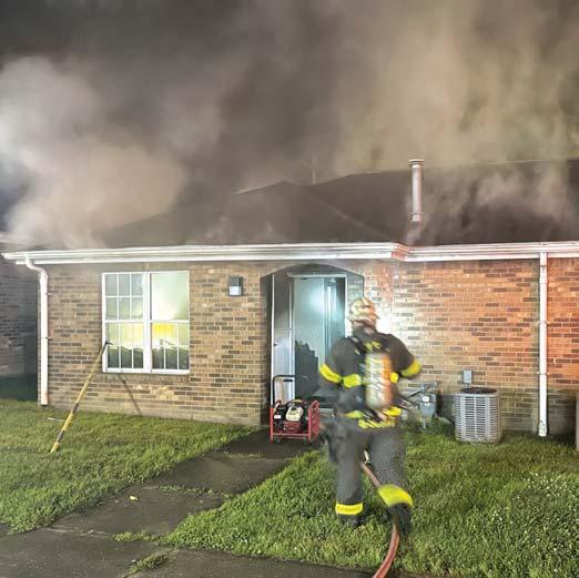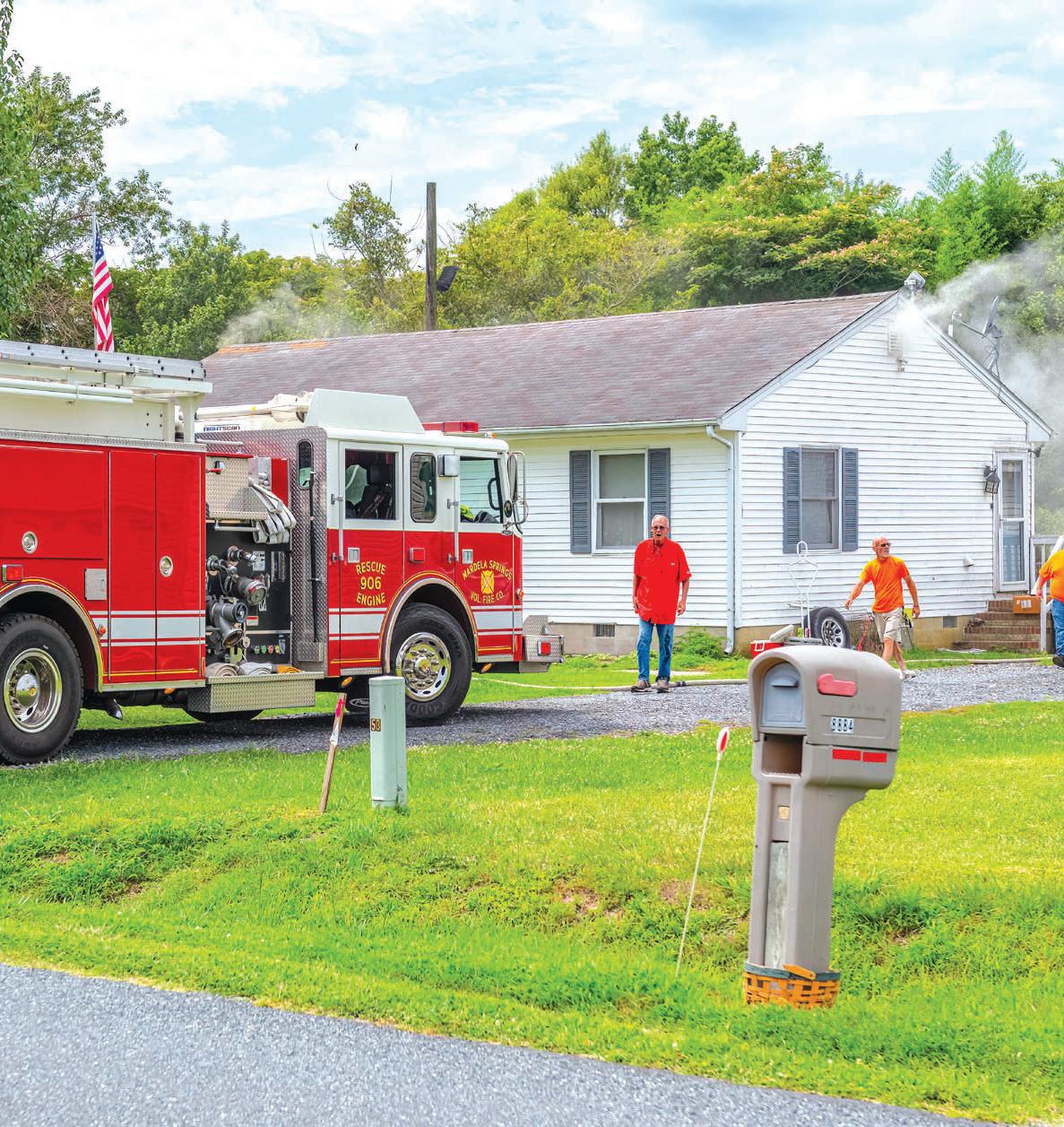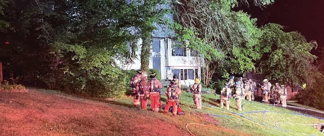 As Kentlands Rescue Engine 33 was backing into quarters from an MVAon Route 50, the bells sounded fora reported house on fire in the 3200 block of Johnson Court. RE 33 arrived to find smoke coming from the roof of a single-story, single-family dwelling. As the company was stretching lines, one resident was attempting to enter the home and a second was exiting the structure. Both of the resi-