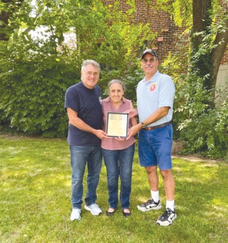 The honor was presented to his widow, Janie Semenecz, by former Chief of the Hasbrouck Heights Fire Department Tim Moots and by former Engine One and Department Secretary, Justin Watrel. Mrs. Semenecz was joined by her sister for the presentation at her home and was very honored to accept recognition from the organization in honor of her husband’s dedication to the Hasbrouck Heights Fire Department and community. Pictured: former Chief Tim Moots, Mrs. Janie Semenecz and former Secretary Justin Watrel.