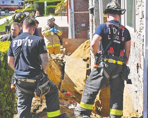 Firefighters from Engine Company 311, TowerLadder158, Rescue Company 4, Rescue Company 2, Squad Company 270 and Squad Company 252 rescued two construction workers trapped in a trench collapse on 229th Street on April 16, 2024. Members removed a slab of concrete that had fallen on the workers using a Hurst tool, then used shoring equipment to remove the workers from beneath the front porch area. The workers were transported in serious condition. - Fire News photo by Lloyd Mitchell