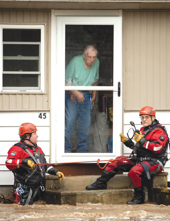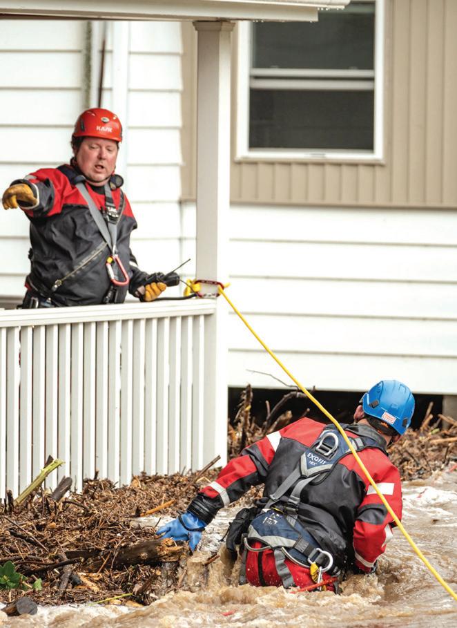 waters. Piermont divers made theirway into the swift moving water, dodging debris being washed down from upstream and made contact with the elderly male. On land, the rope teams worked togetherto formulate a plan on how to best remove the homeowner as safely as possible. Eventually a high line and Stoke’s basket became the consensus among the rescuers. The heavy rain had subsided due to a small break in the storm while the operation was ongoing, allowing the water’s velocity to slow considerably as well as becoming shallower. With this improvement in conditions, the rescue plan was altered and a small boat was brought in to remove the homeowner. The man was brought to waiting EMS crews, who checked him and found him to be uninjured from his ordeal.