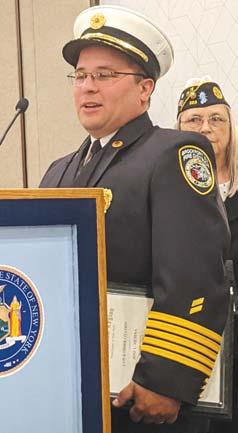 The harrowing rescue occurred on June 1, 2022, on Salmon Creek Road in the Town of Sweden. Mr. Moore’s vehicle struck a tree trapping him inside while the engine compartment was burni ng out of control. Efforts to extinguish were failing as the fire was creeping into the passenger compartment prior to the arrival of fire apparatus. Chief Medina was able to climb in the rear seat to f ree Moore from the wreckage. Passing the now semi-conscious Moore to law enforcement assisting, the Chief was able to exit the ve hicle with only moments to spare. The fire advanced rapidly following the rescue engulfing the entire vehicle. “This is a prime examp le of one of our firefighters placing himself in harm’s way to save the life of another,” said Laurence Vaughan, Past Chief of the Brockport Fire District.
