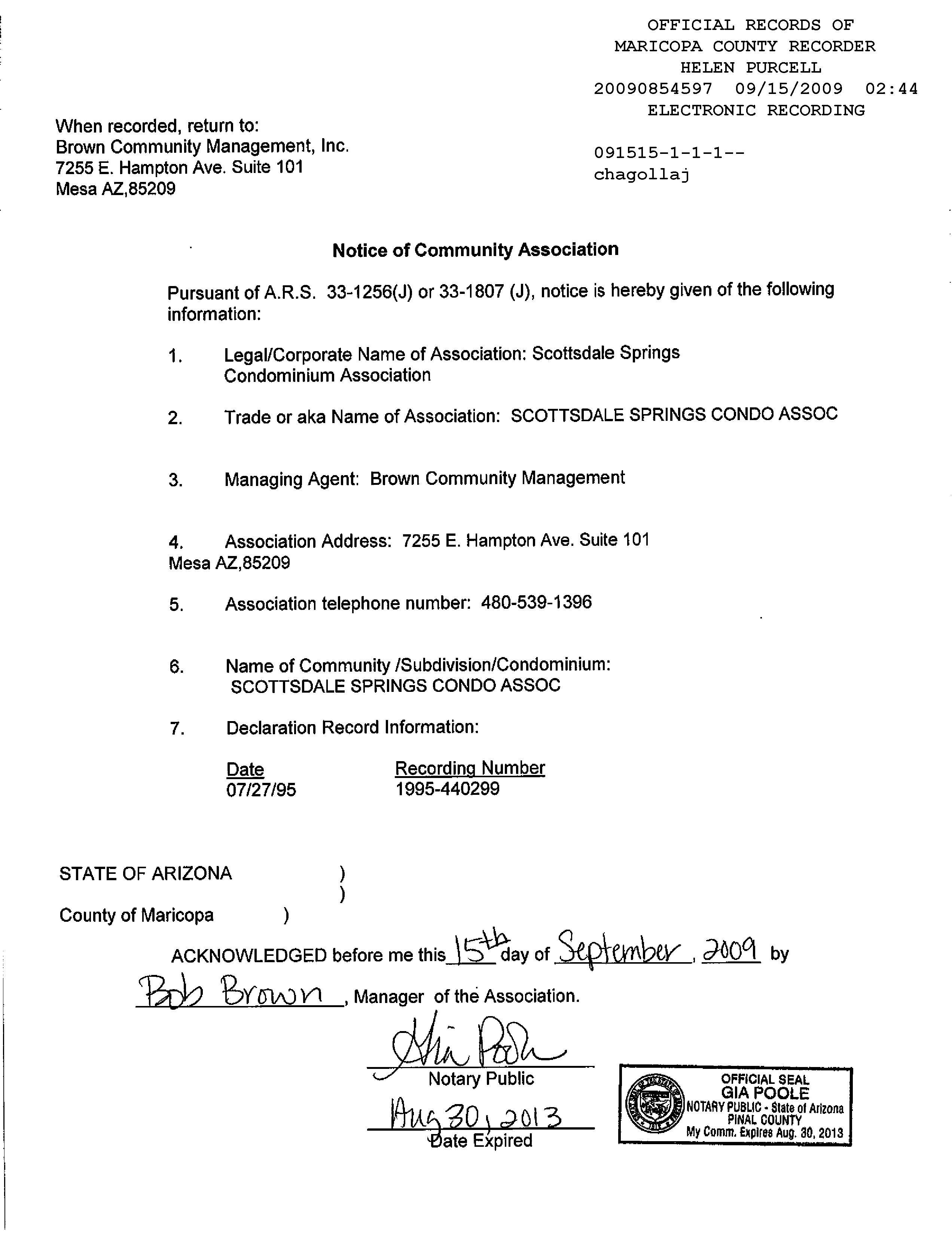 MARICOPA, AZ Document:NOT HOA 2009.854597 Page:1 of 1 Printed on:9/7/2023 5:09 PM Branch :FC0 User :JSTI