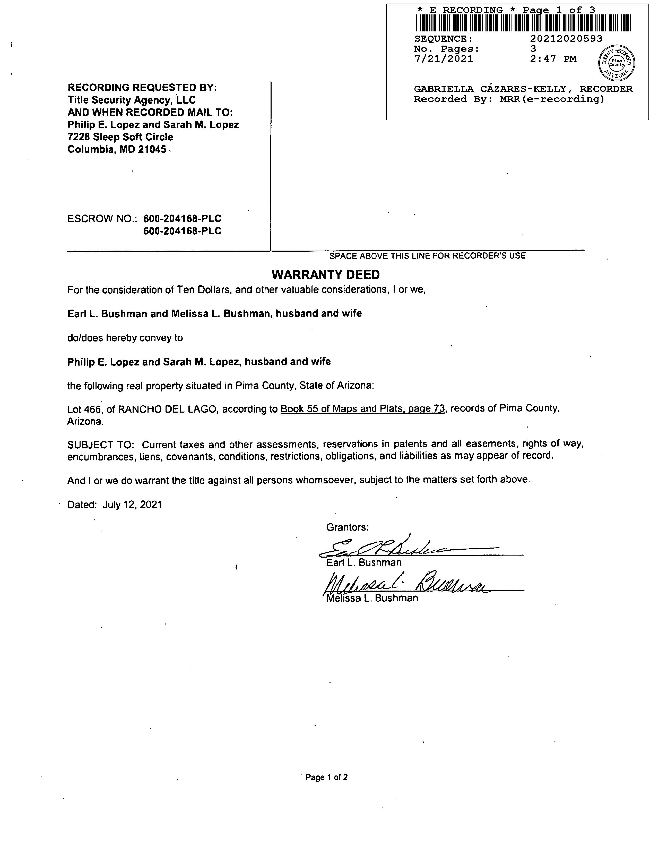 Owner Name: Lopez Philip E /Lopez Sara M APN / Alternate APN: 305-04-6290 / Deed Type: Warranty Deed Land Use: Sfr Subdivision / Tract: Del Lago Rho / Lot Size: 7,728 Year Built / Eff: 2003 / Rec. Date / Price: 07/21/2021 / $420,000 Living Area: 1,706 # of units: