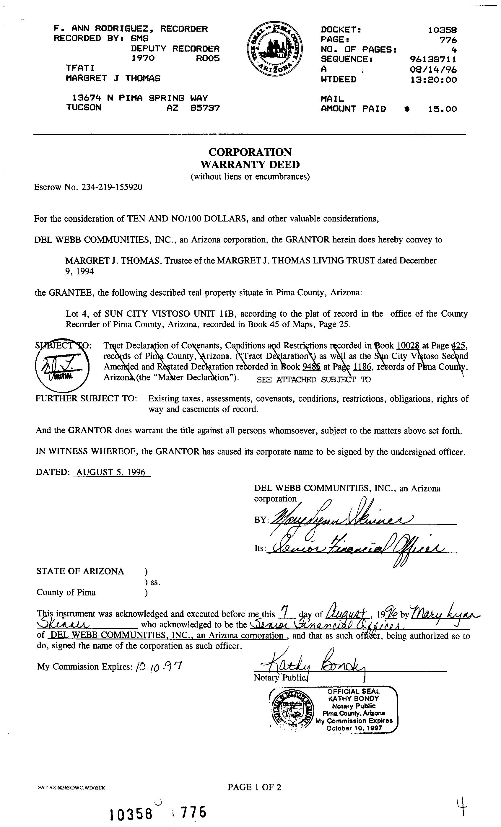 Legal Description : Sun City Vistoso Unit 11b Lot 0004