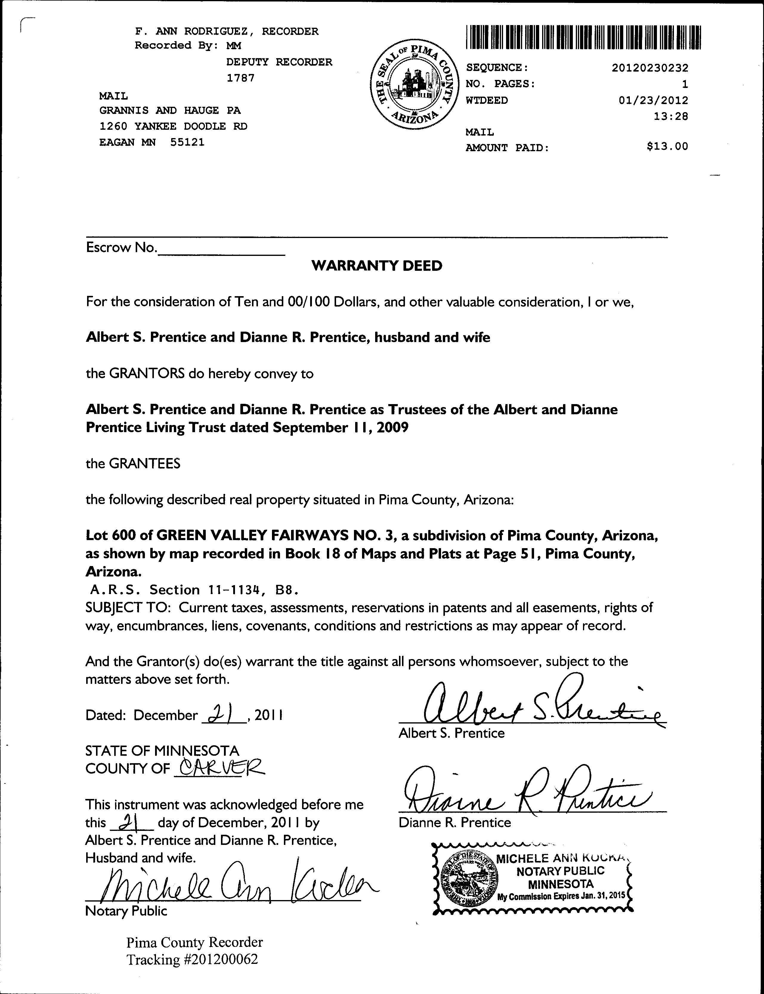 Recording/Sale Date : 01/23/2012 / 12/21/2011 Deed Type : Warranty Deed