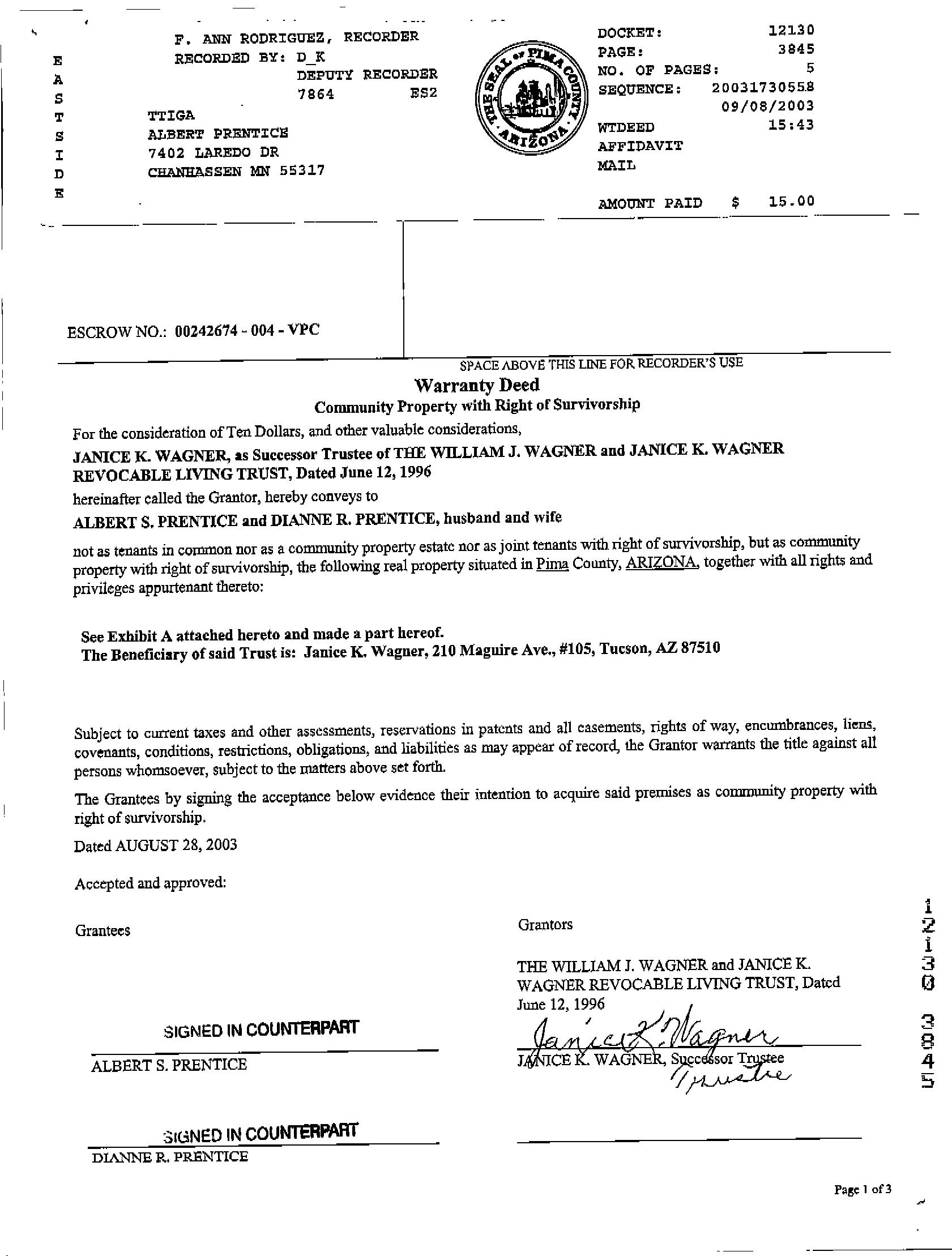 Recording/Sale Date : 09/08/2003 / 08/28/2003 Deed Type : Warranty Deed