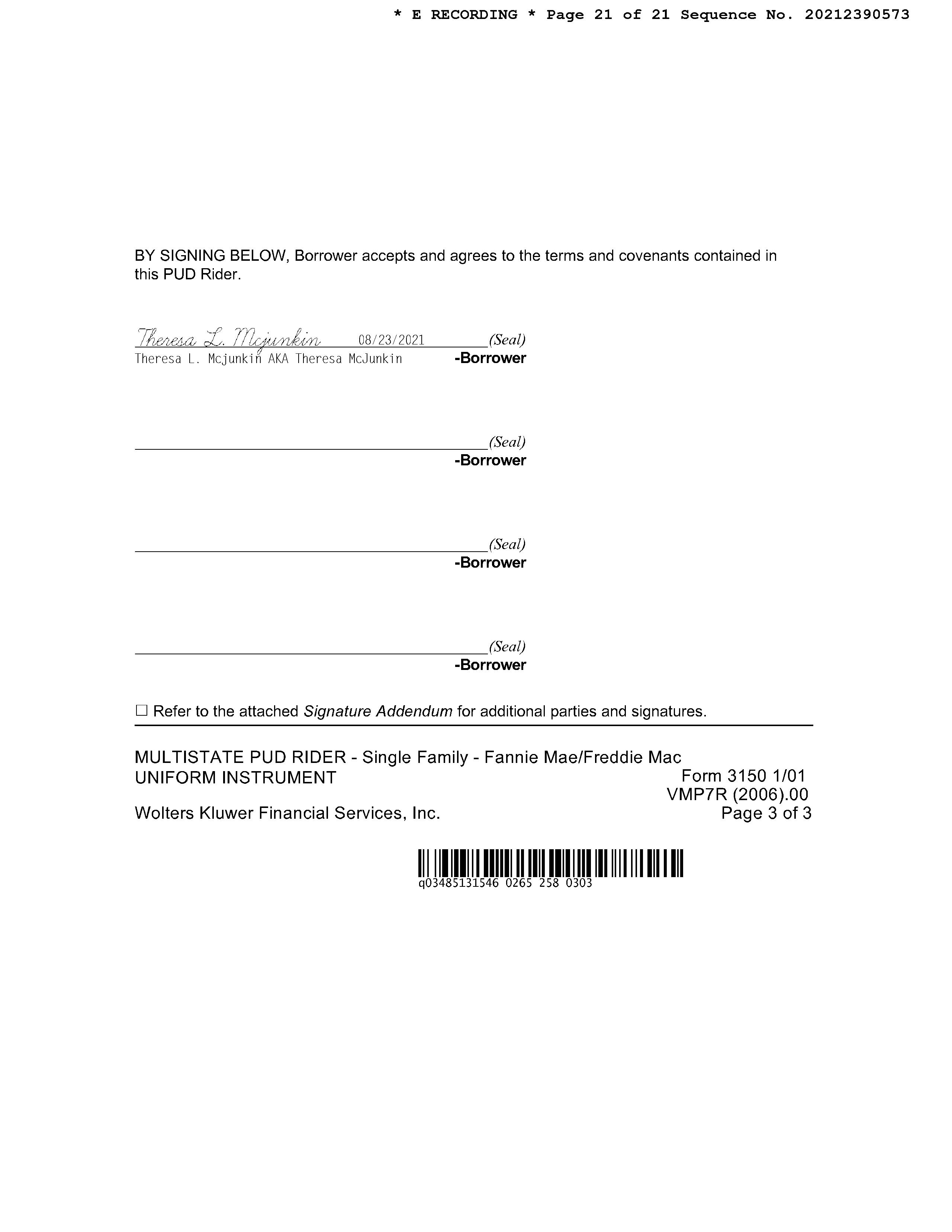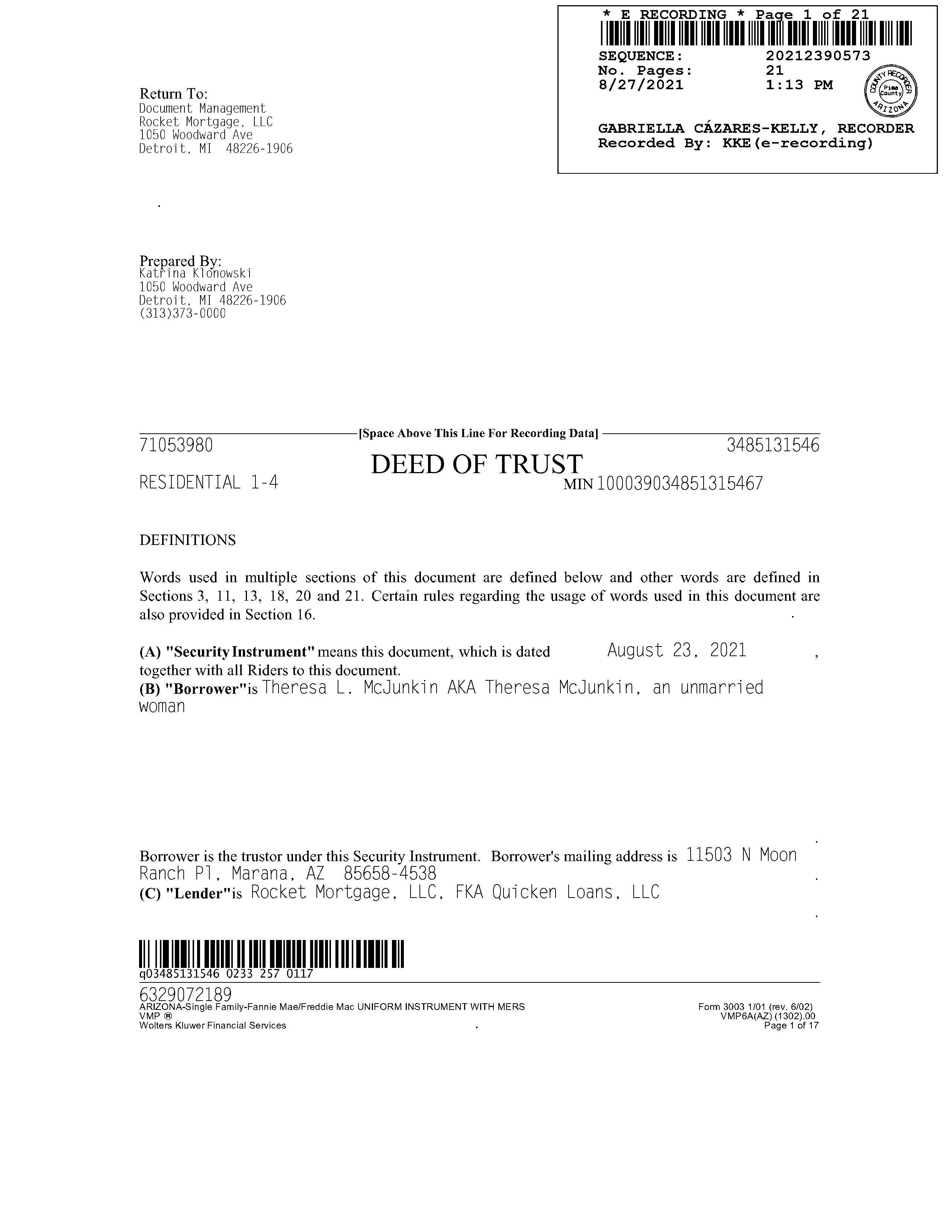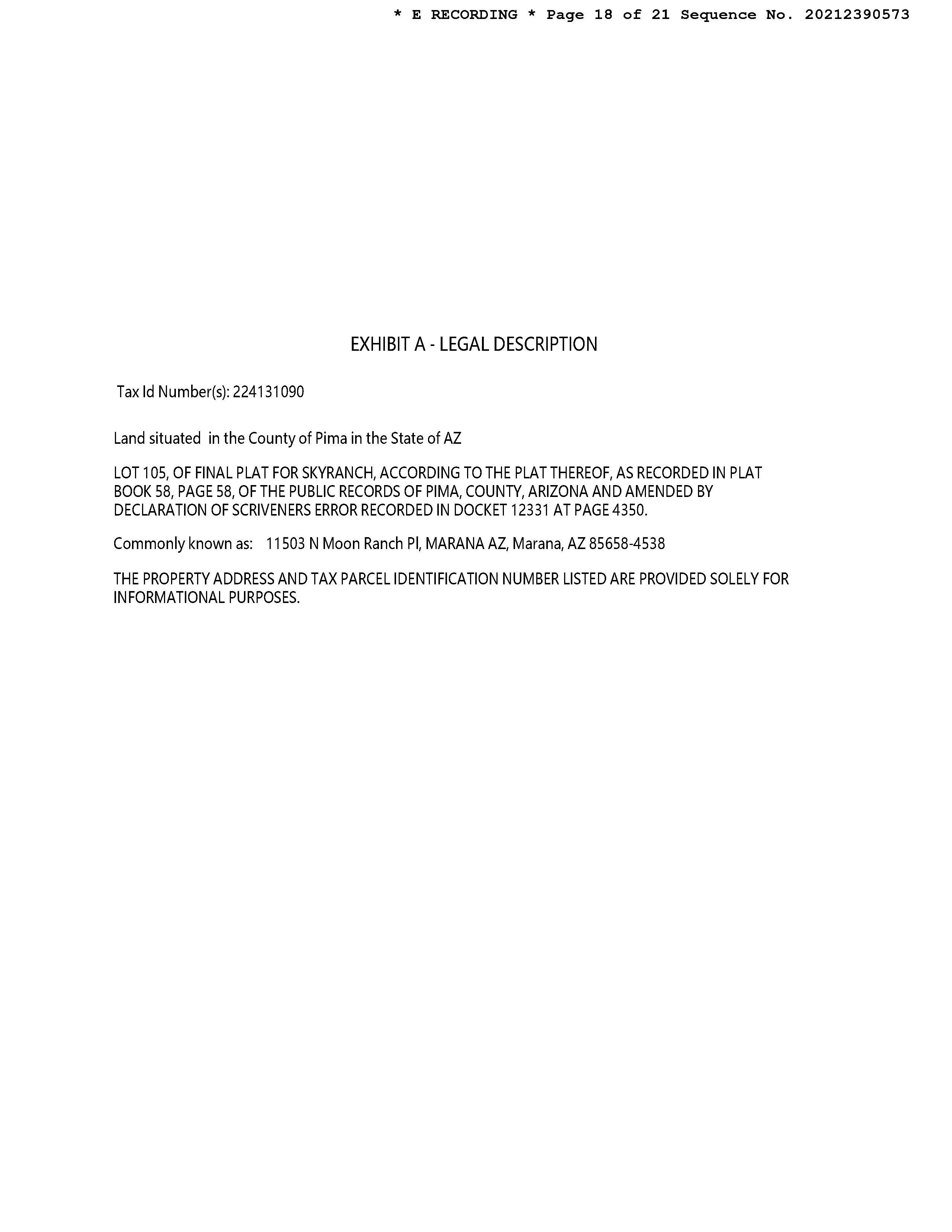 + FIRST AMERICAN TITLE, FC0, LMRA PIMA, AZ 08/19/2022 12:22PM RL13 INVESTIGATIVE SEARCH RESULTS PAGE 1 OF 1 SEARCH PARAMETERS PARCEL: 224-13-1090 PARCEL: 224-13-1090 INSTRUMENT REC DATE OWNER: MC JUNKIN THERESA 13538 1333 04/16/2009 SITUS: 11503 N MOON RANCH PL MAR MAIL: 11503 N MOON RANCH PL MARANA AZ 85658-4538 PLAT: LOT 00105 BLOCK LEGAL: SKYRANCH LOT 105 CURRENT TAXES INFORMATION THROUGH 07/28/2022 LAND IMPR EXEMPT RATE AREA SPECIAL DISTRICTS PRIMARY 30,207 0 0 9.6812 0612 SECONDARY 50 30,157 0 6.4416 2021 TOTAL TAX BILLED 4,365.75 2021 TAX AMT TAX DUE INTEREST DATE PAID TOTAL DUE FIRST HALF 2,182.88 0.00 0.00 10/23/2021 0.00 SECOND HALF 2,182.87 0.00 0.00 05/28/2022 0.00 TOTAL CURRENT TAXES DUE 08/22 0.00 09/22 0.00 IMPROVEMENTS BYPASS BLDG SQFT 2,503 FULL CASH VALUE 302,074 YEAR BUILT 2007 LAND USE 01 41 NUMBER OF STORIES 1.0 LOT SIZE 1 STDLT STORIES HEIGHT 0 SCHOOL DISTRICT 0612 EXTERIOR WALLS ADOBE LAND FULL CASH VALUE 502 GRADE MATERIALS IMPR FULL CASH VALUE 301,572 SALES SALE DATE SALE AMOUNT INSTRUMENT TYPE SELLER NAME VALIDITY 04/16/2009 262,500 13538 1333 WD HURLEY BRETT 07/27/2007 470,000 13106 3265 SW FIDELITY NATIONAL TITLE AG ADDITIONAL PROPERTY INFORMATION STANDARD LAND USE: SFR END SEARCH