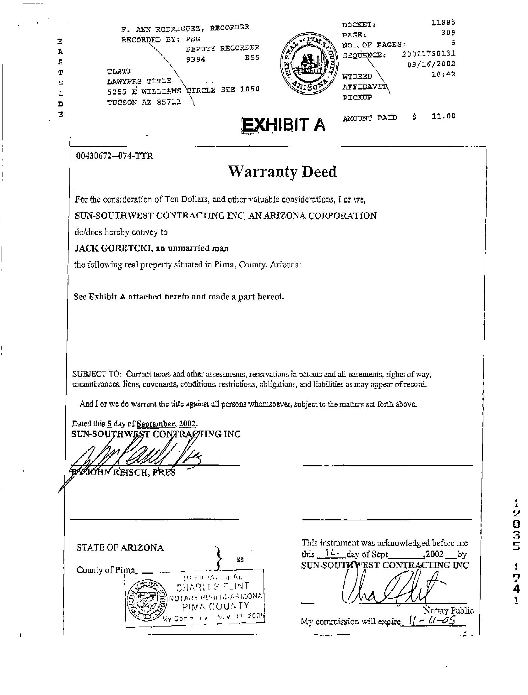 #5   11979 W Eagles Wing Way Tucson Az 85735 Owner Name: Villa Jose / APN / Alternate APN: 209-05-002H / Deed Type: Warranty Deed Land Use: Mobile Home Subdivision / Tract: Tucson West / Lot Size: 179,903 Year Built / Eff: 2005 /2005 Rec. Date / Price: 12/16/2022 / $165,000 Living Area: # of units: Document #: 3500086 Bedrooms: Pool: Total Tax Value: $48,495 Bath(F/H): / #6   11360 W Park Rd Tucson Az 85735 Owner Name: Sonntag Jeffery /Austin Shea APN / Alternate APN: 209-04-0250 / Deed Type: Warranty Deed Land Use: Mobile Home Subdivision / Tract: / Lot Size: 90,605 Year Built / Eff: 2002 /2002 Rec. Date / Price: 02/01/2023 / $203,500 Living Area: # of units: Document #: 320273 Bedrooms: Pool: Total Tax Value: $64,584 Bath(F/H): / #7   11310 W Park Rd Tucson Az 85735 Owner Name: Integrity Investing Llc 20% /Ira Club F Kirin David Desai 2 APN / Alternate APN: 209-04-019B / Deed Type: Warranty Deed Land Use: Mobile Home Subdivision / Tract: / Lot Size: 71,003 Year Built / Eff: 1998 /1998 Rec.