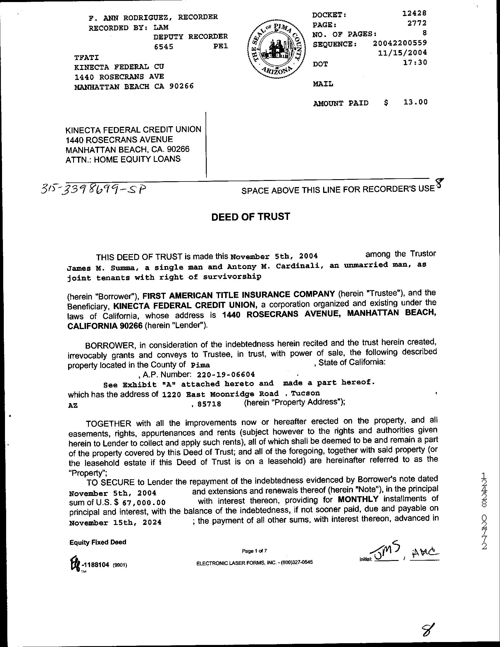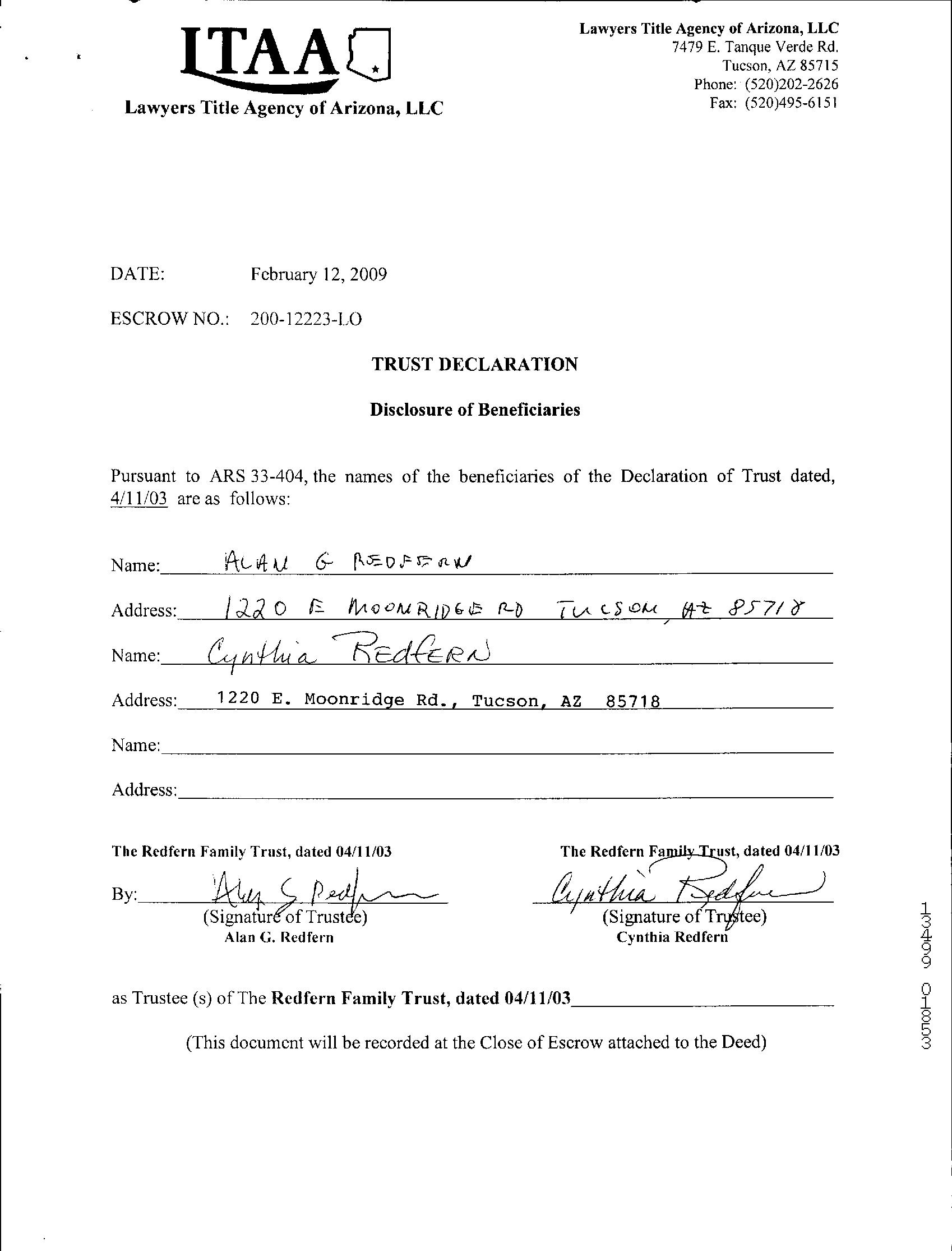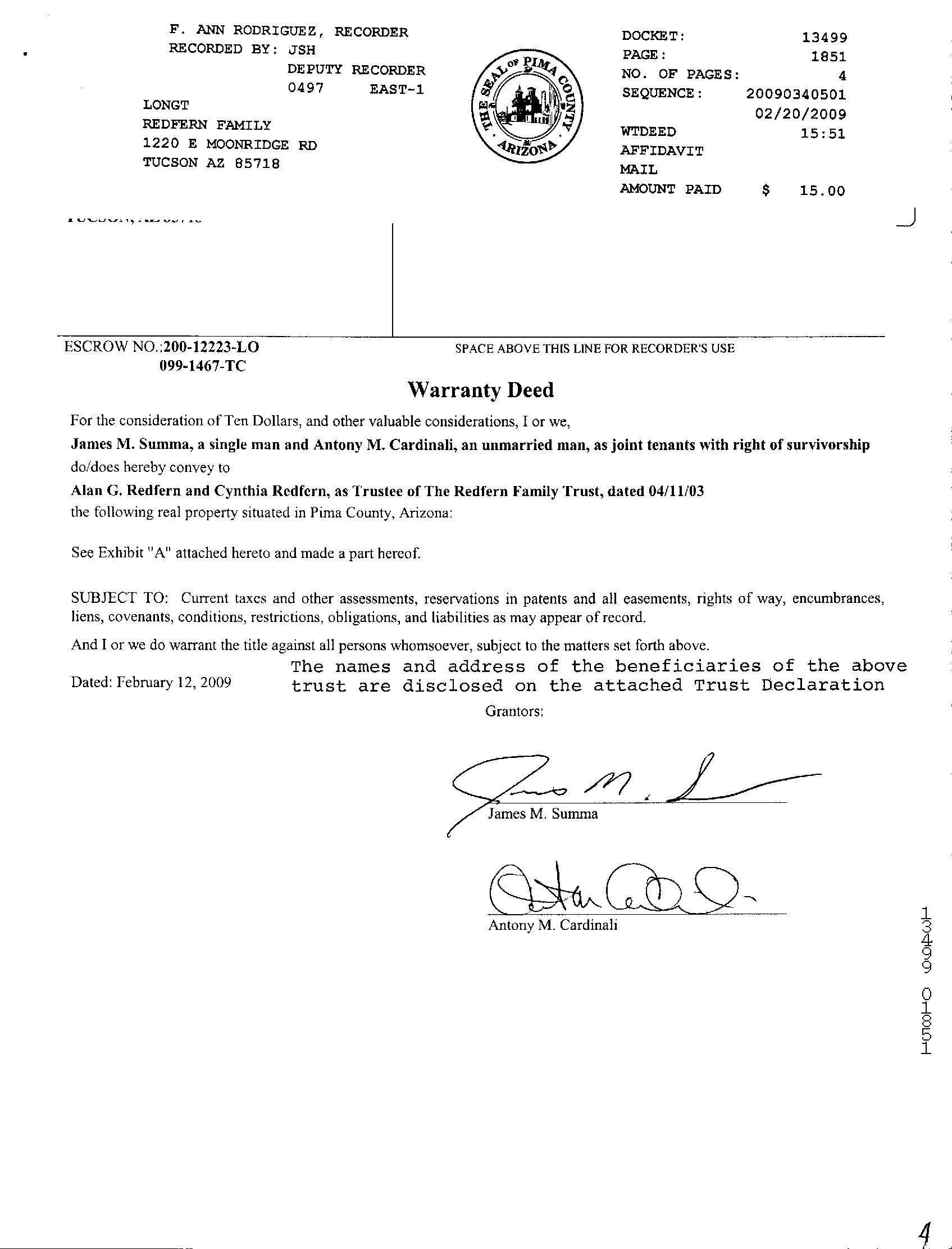 #5 1521 E Thunderhead Dr Tucson Az 85718 Owner Name: Schiavo Joseph /Dardon-schiavo Heidy P
