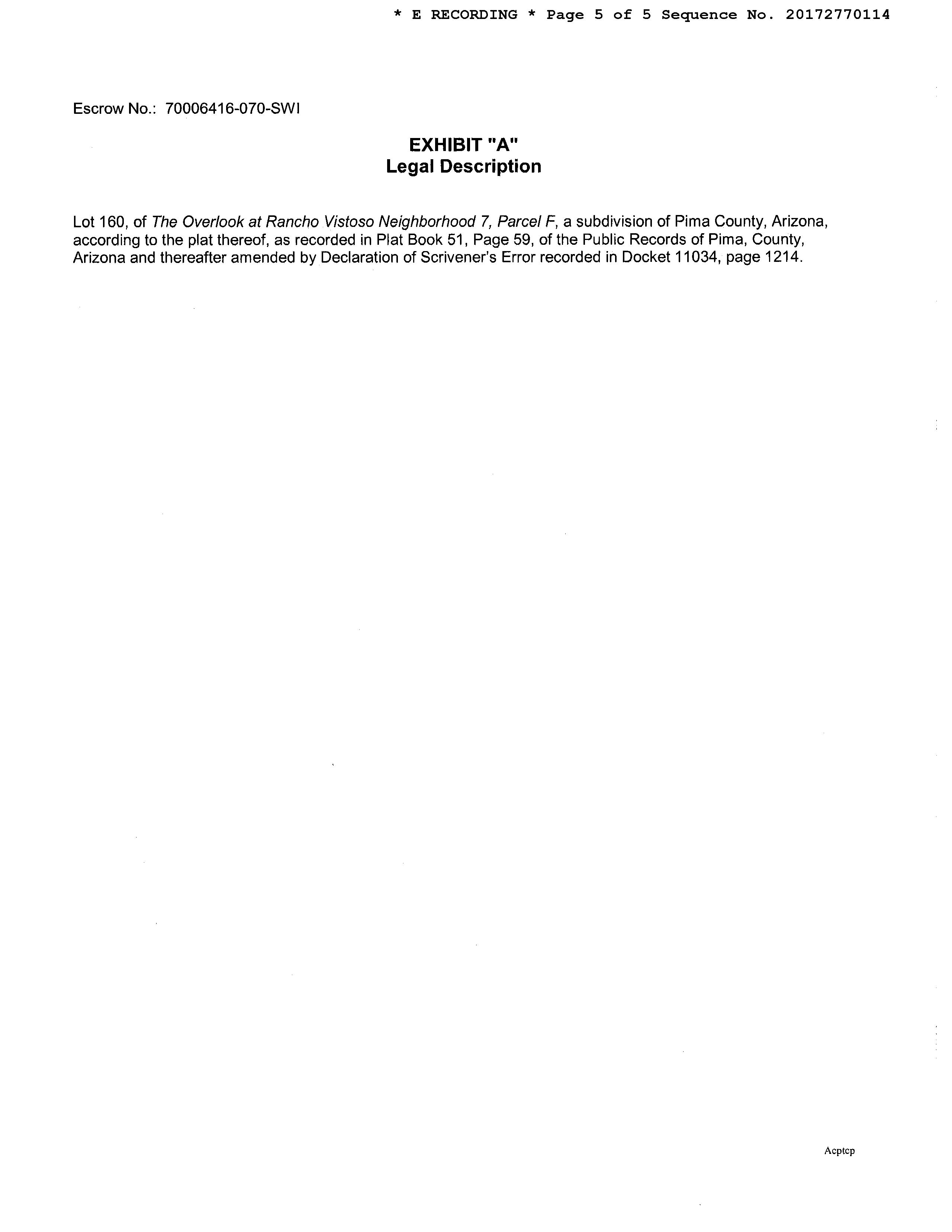 Legal Description : Overlook At Rancho Vistoso Neighborhood 7 Parcel F Lot 160