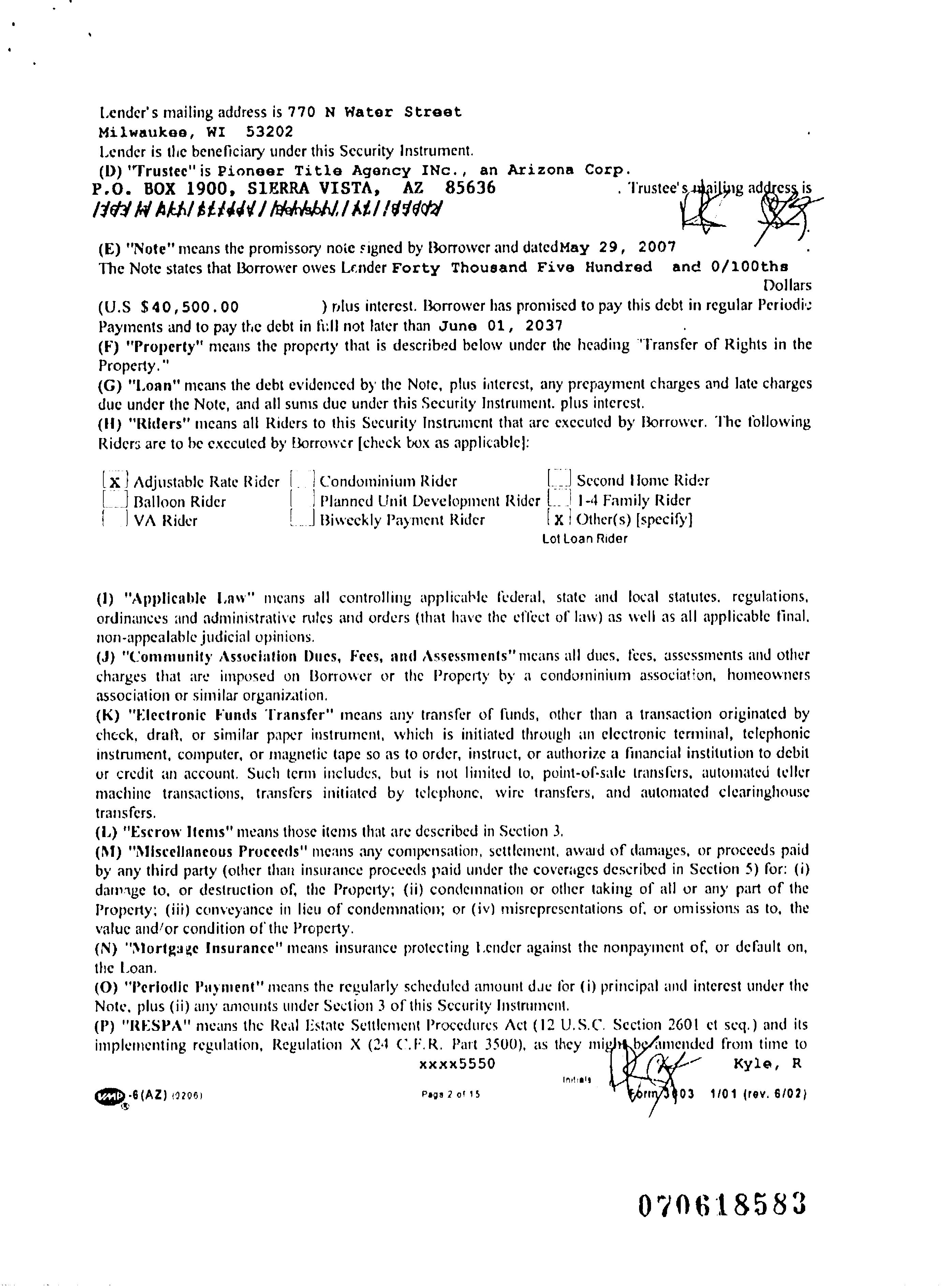 Recording/Sale Date : 06/01/2007 / 05/31/2007 1st Mtg Amount/Type : $40,500 / Cnv