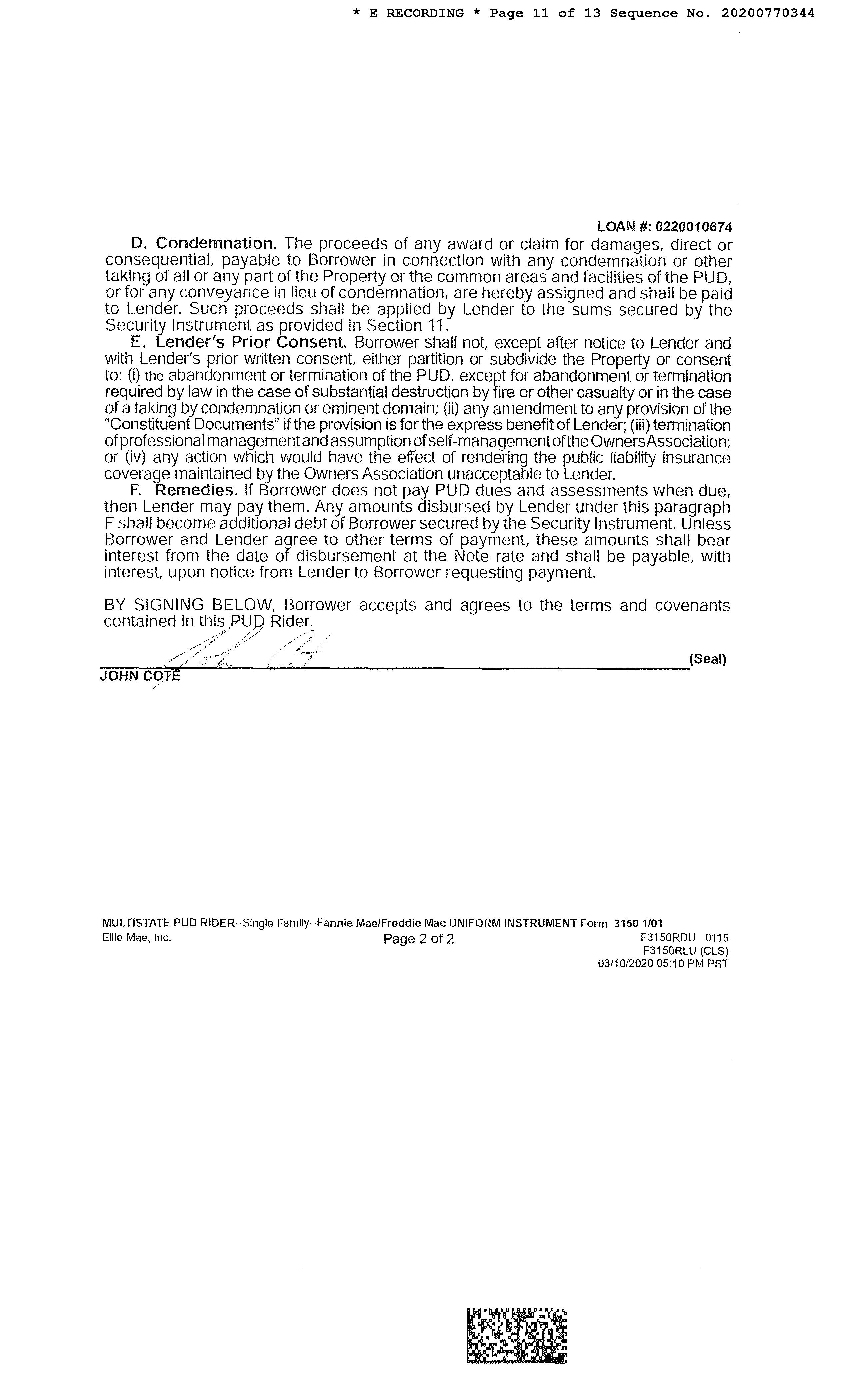 Subject Property : 1340 E Dejerine Pl Tucson AZ 85737 Owner Information Owner Name : Cote John Mailing Address : 1340 E Dejerine Pl, Tucson AZ 85737-3444 R107 Owner OccupiedIndicator : O Location Information Legal Description : Catalina Shadows Estates Lot 230 County : Pima, Az APN : 220-05-2400 Census Tract / Block : 46.42 / 1 Subdivision : Catalina Shadows Estates Township-Range- Sect : 12S-14E-6 Map Reference : 06-12S-14E Legal Book/Page : 41-24 School District : Amphitheater Legal Lot : 230 Munic/Township : Amphitheater Market Area : 420 Owner Transfer Information Recording/Sale Date : 11/13/2018 / 11/06/2018 Deed Type : Quit Claim Deed Document # : 3170683 Last Market Sale Information Recording/Sale Date : 11/08/2018 / 11/05/2018 1st Mtg Amount/Type : $199,200 / Cnv Sale Price : $249,000 1st Mtg Document # : 3120292 Document # : 3120291 1st Mtg Term : 30 Deed Type : Warranty Deed Price Per SqFt : $156.02 Title Company : Signature Title Agcy/az Llc Lender : Nova Fin'l & Inv Corp Seller Name : Eide Kelly Prior Sale Information Prior Rec/Sale Date : 09/22/1994 / 09/00/1994 Prior Doc Number : 9883-822 Prior Sale Price : $116,078 Prior Deed Type : Deed (reg) Customer Name : Jeremiah Stiffler Customer Company Name : First American Prepared On : 08/15/2022 © 2022 CoreLogic. All rights reserved