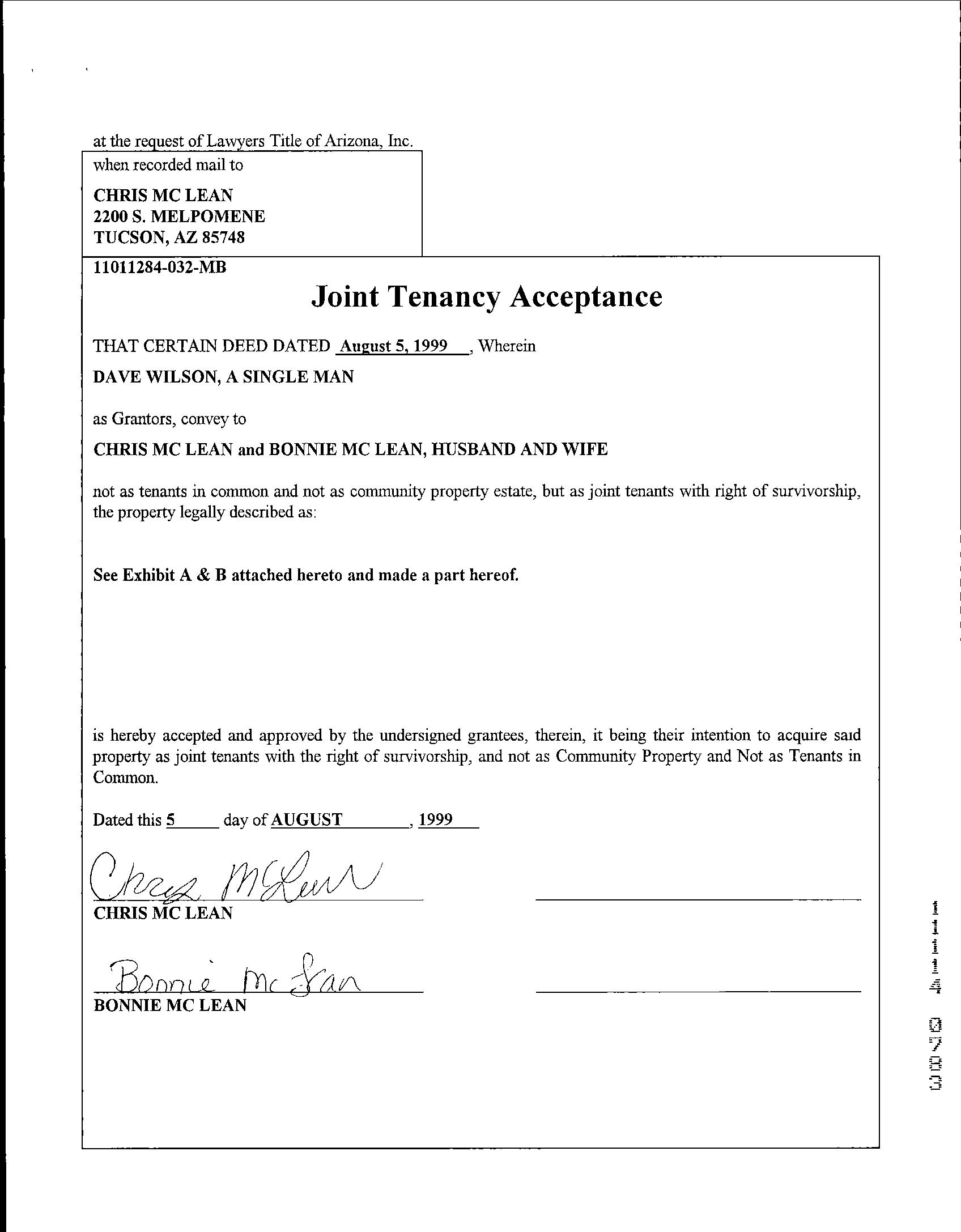 OWNER: MC LEAN CHRIS & BONNIE JT/RS 11114 780 08/19/1999 SITUS: 13815 E HORSE WHISPER TR PC MAIL: PO BOX 902 VAIL AZ 85641