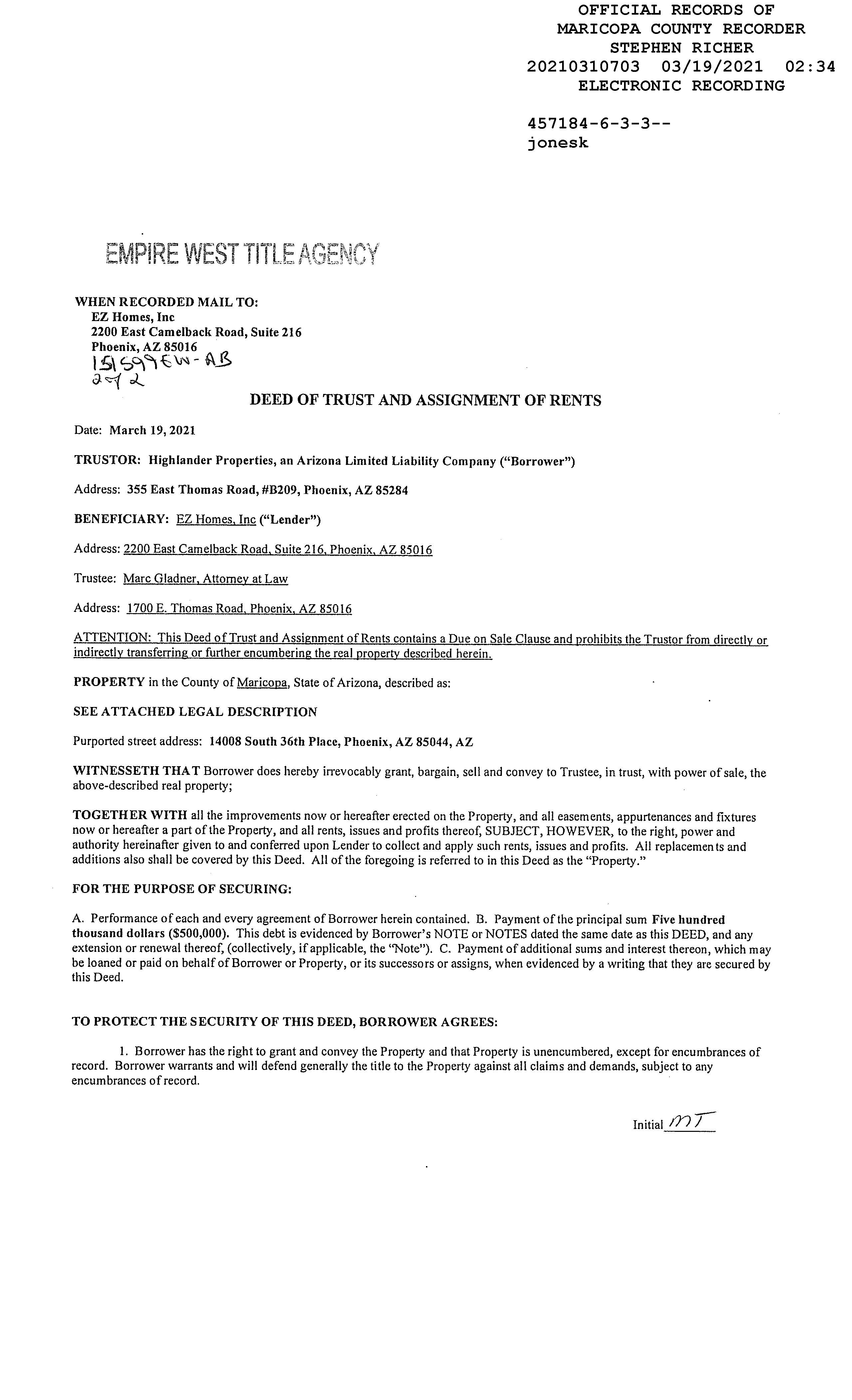 Property: 14008 S 36th Pl Phoenix Az 85044 Owner Name: Highlander Properties Llc / APN / Alternate APN: 306-01-752 / Deed Type: Warranty Deed Land Use: Sfr Subdivision / Tract: Diamond Ridge Lt 1-60 Tr A-h / Lot Size: 11,452 Year Built / Eff: 1987 / Rec. Date / Price: 03/19/2021 / $590,000 Living Area: 2,896 # of units: Document #: 310702 Bedrooms: Pool: Pool Total Tax Value: $466,300 Bath(F/H): /