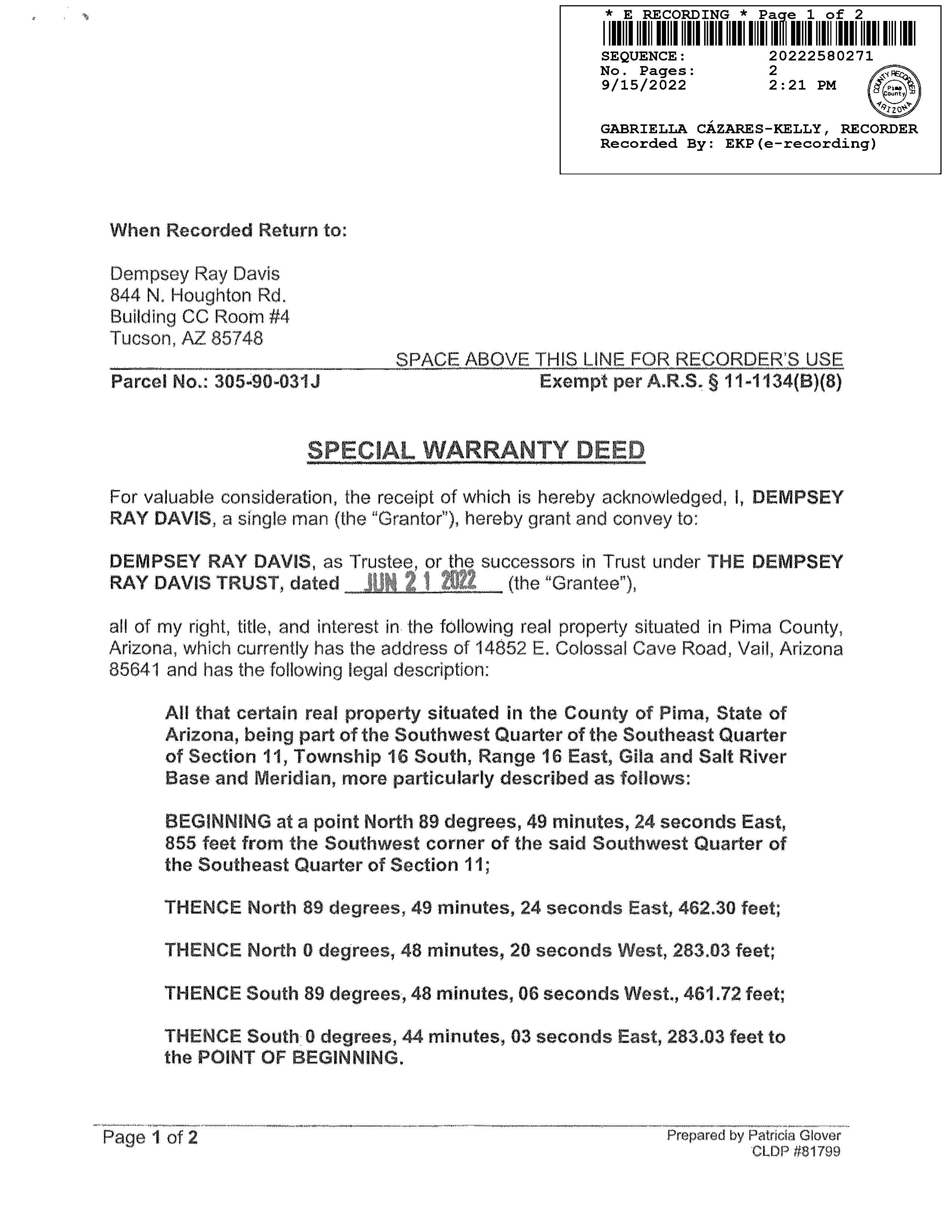Subject Property : 14852 E Colossal Cave Rd Vail AZ 85641