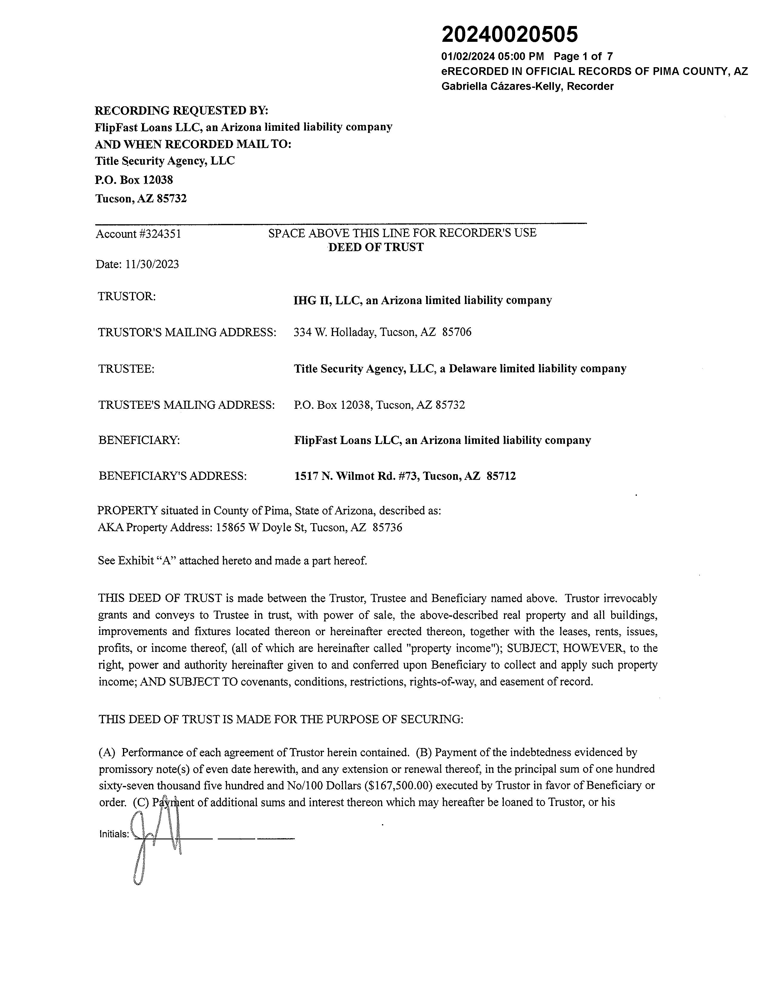 Subject Property :   15865 W Doyle St Tucson AZ 85736 Owner Information Owner Name : Ihg Ii Llc Mailing Address : 15865 W Doyle St, Tucson AZ 85736-2614 H006 Vesting Codes : / / Corporation Owner Occupied Indicator : O Location Information