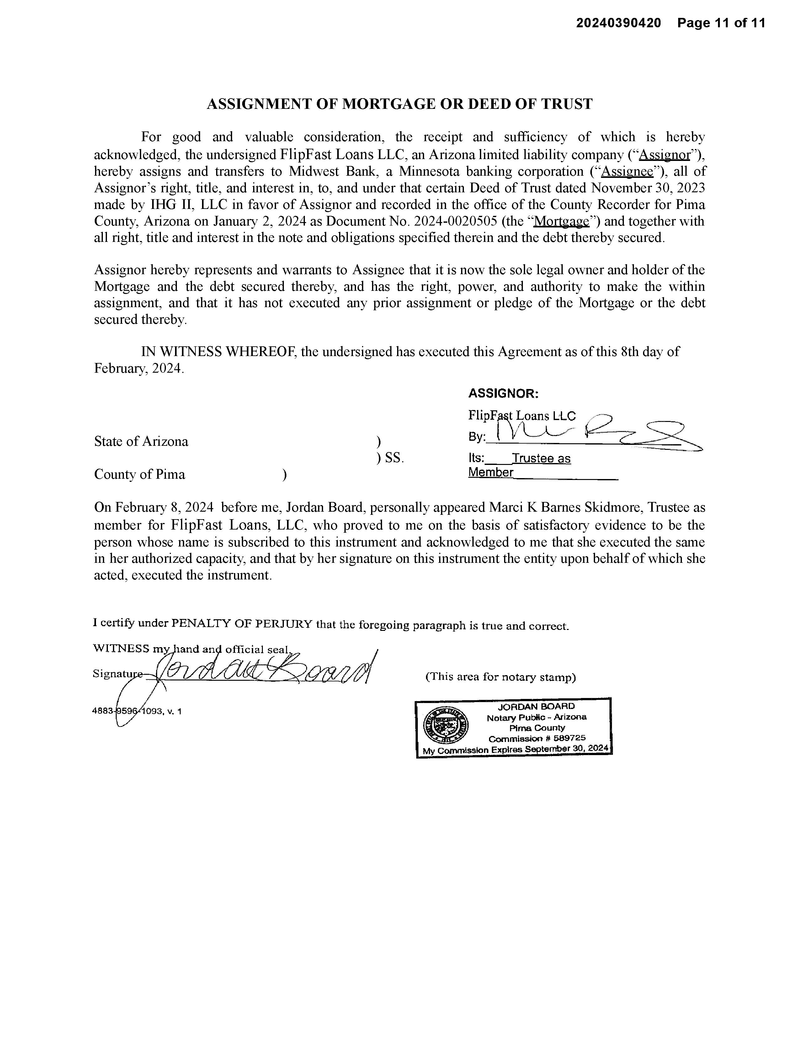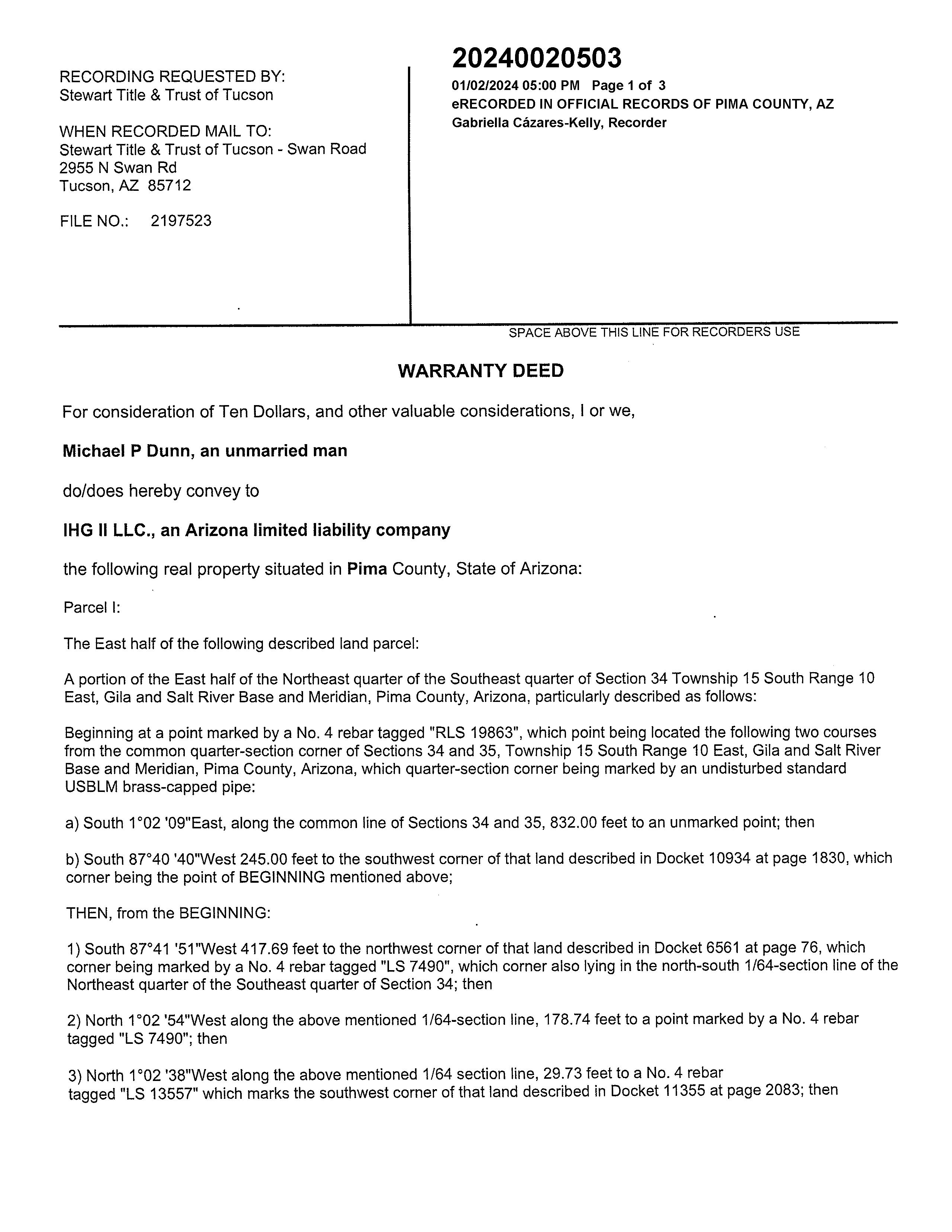 Recording/Sale Date : 01/02/2024 / 12/22/2023 1st Mtg Amount/Type : $167,500 Document # : 20503 1st Mtg Document # : 20505 Deed Type : Warranty Deed 1st Mtg Term : 1 Title Company : Stewart Title & Tr/tucson Seller Name : Dunn Michael P