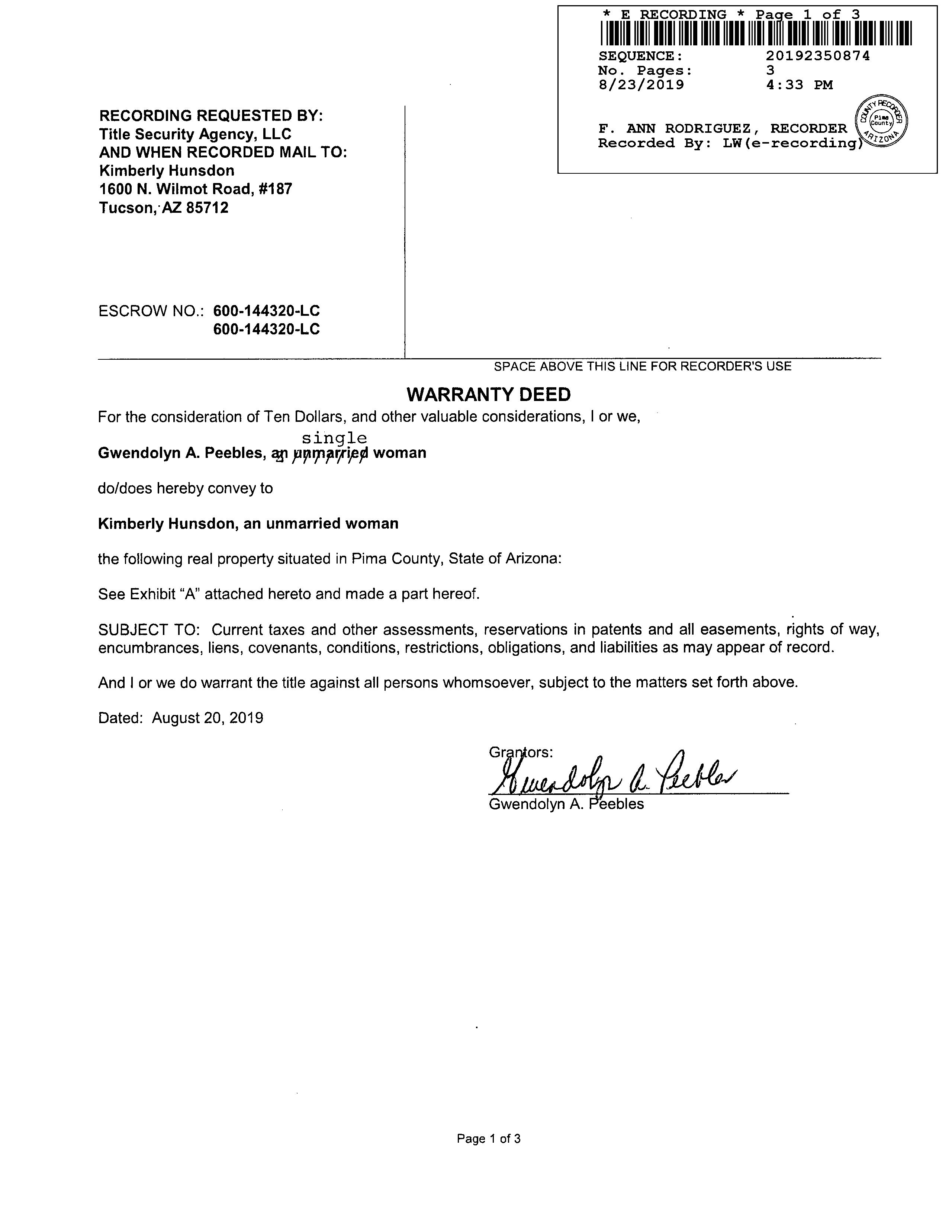 Owner Name: Hunsdon Kimberly / APN / Alternate APN: 133-16-2250 / Deed Type: Warranty Deed