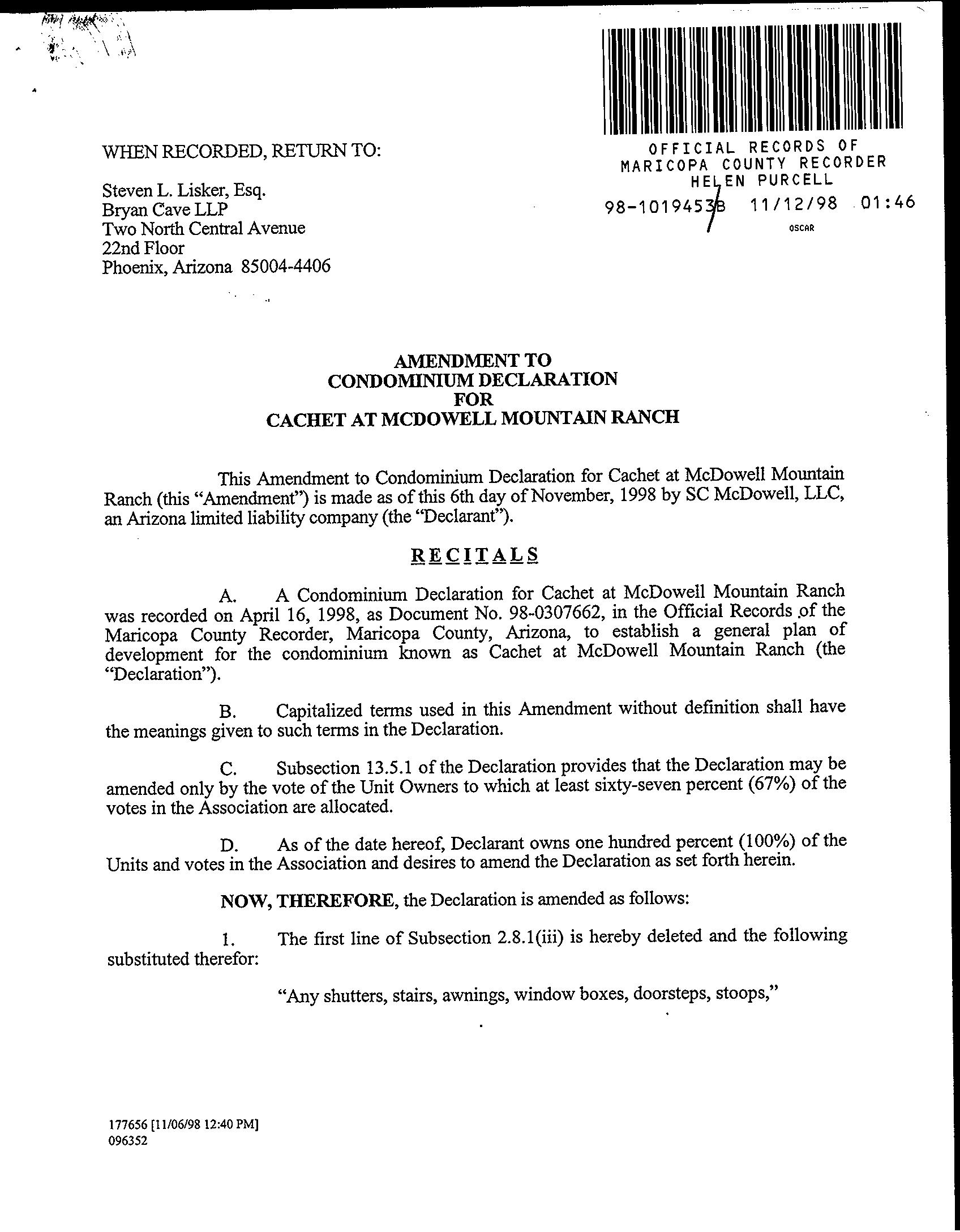 MARICOPA, AZ Document:MIS 1998.1019453B Page:1 of 12 Printed on:2/9/2023 11:21 AM Branch :FC0 User :JSTI
